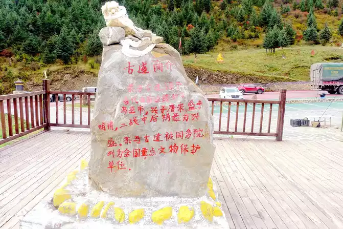 After leaving Yajiang County, the national highway G318 began to climb higher again, and beautiful yellow leaves also appeared on the hillside, passing through the "Xiangge Zong" at 10:38, which is a small village at an altitude of 3530 meters, and is also the starting point of the famous winding mountain road "Eighteen Bends of the Heavenly Road" on the national highway G318. The car circles along the road, the altitude gradually rises, and at 10:47 it stops at the "Xianggezong Service Area", which is the middle section of the "Eighteen Bends of the Heavenly Road", equipped with a large area of parking lots, as well as public toilets and canteens, and there is a boulder on the wooden observation deck, and the red paint paints "Tea Horse Ancient Road 3800 meters above sea level".