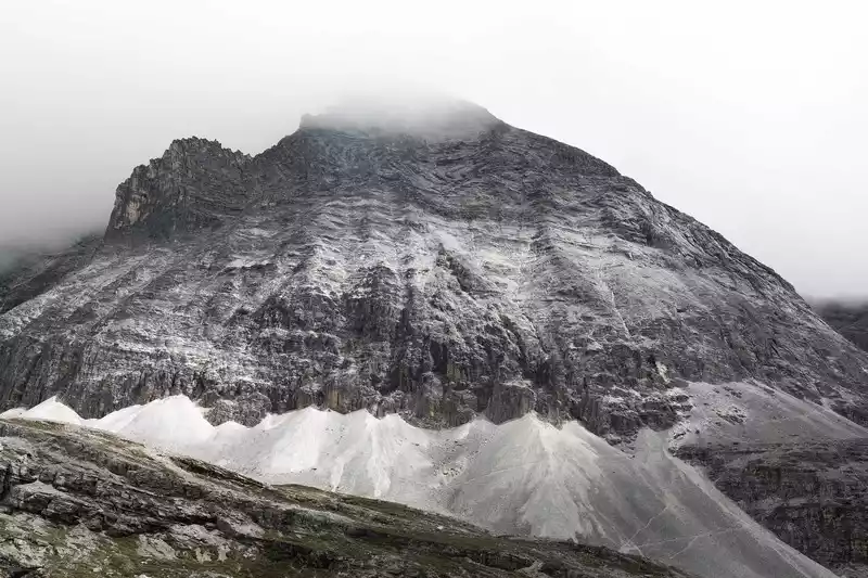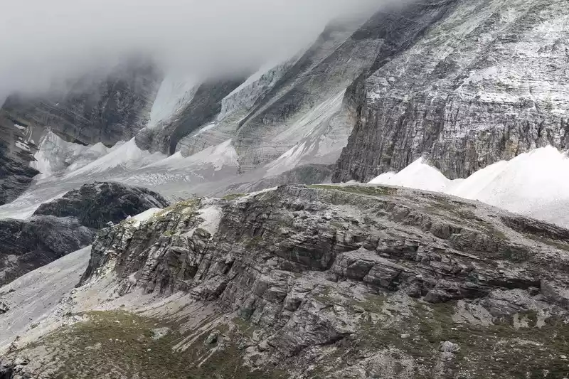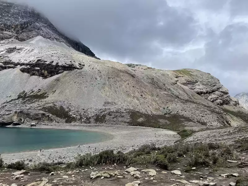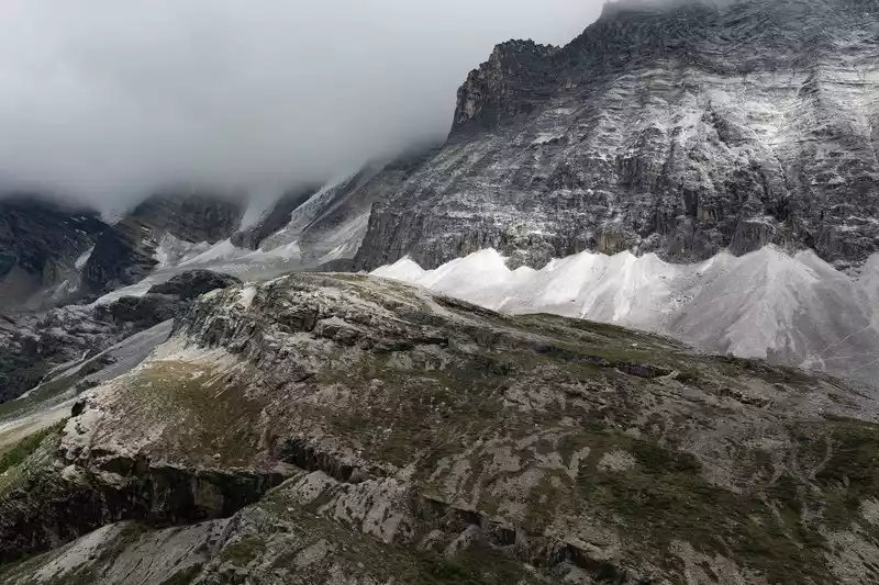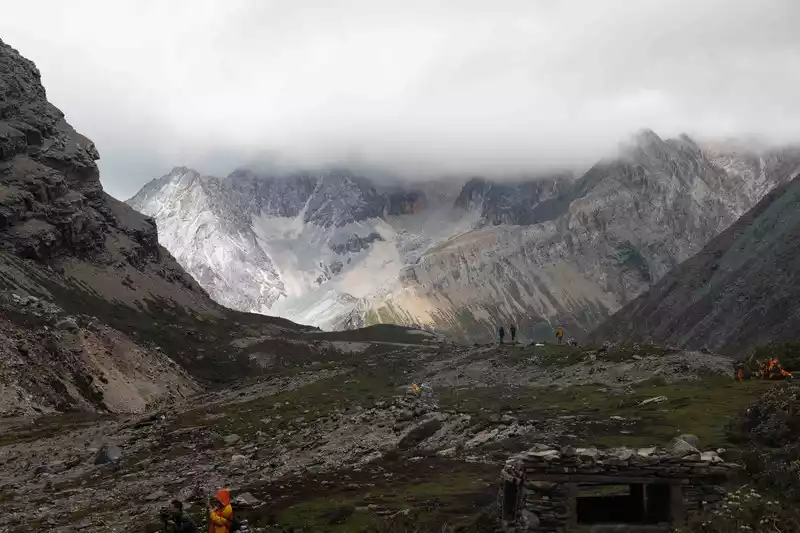 On the way up the mountain, it began to rain heavily, although there has been rain on the road, but it won't be long before it will stop, but this time, when we reached the Sacrifice Cliff, the rain began to fall hugely, the wind was particularly strong, and the body began to become stiff, coupled with the wet shoes, it was already a little hypothermic in the initial state, I asked my girlfriend, my girlfriend was not in a good state, fortunately, we wore jackets and mountaineering socks, here it is strongly recommended that these two things must be brought for mountaineering! On the way to continue to rise, the two of us walked very fast, and it would be very cold if we stopped, and the thin down jacket I wore that day was already red from the cold when I took my hand out of my pocket. There was a fork in the road near the end, and a shelter was built next to the fork, and we could see that everyone was here to keep warm, and we also struggled to squeeze in and rest for a while. You can see that everyone's face is tired and anxious, which is completely different from the overall state at the foot of the mountain, presumably everyone is in the same state as we are now, cold and tired, you must know that there is no backup at the top of the mountain, although the mood has become a little heavy, fortunately, there is still a kilometer behind, we have almost recovered in the cabin, so we continue to move forward. Not long after walking, I suddenly saw the milk lake, and I didn't dare to confirm it, so I trotted two steps, excitedly called my girlfriend to come and see, and she also ran excitedly, but we both began to lack oxygen, took two breaths of oxygen, and immediately "lived".