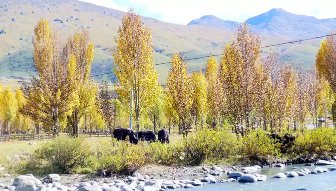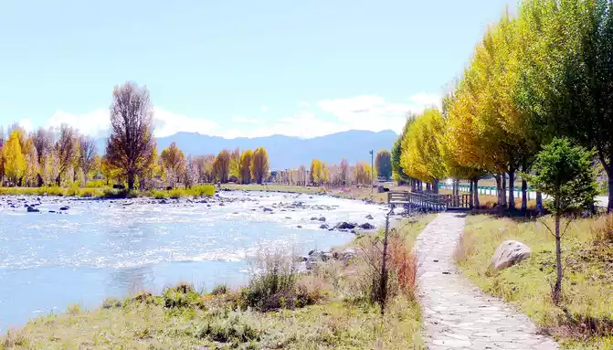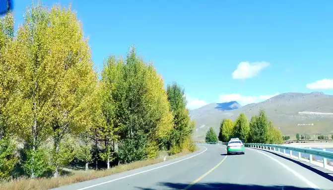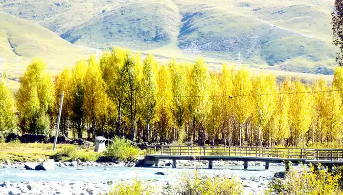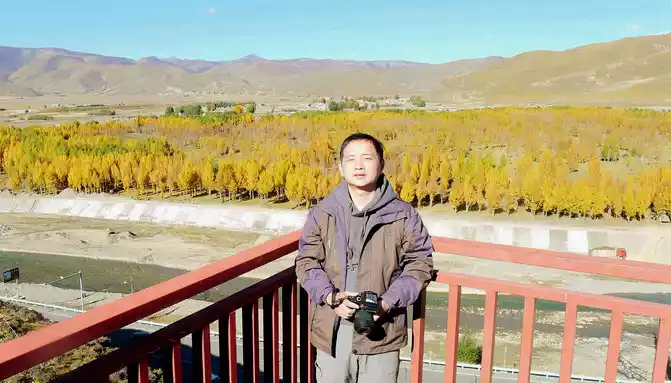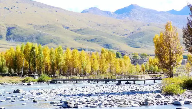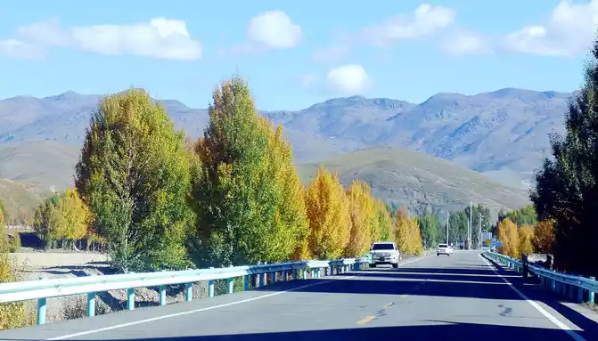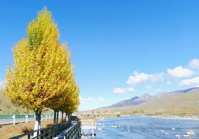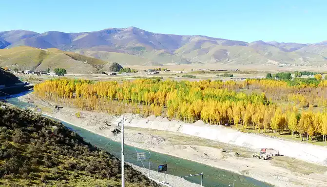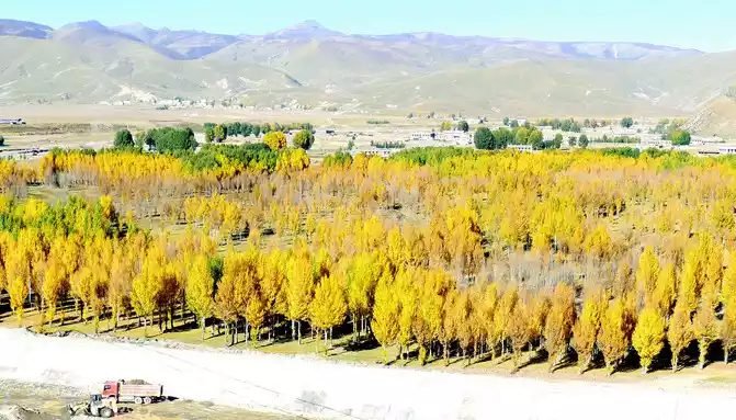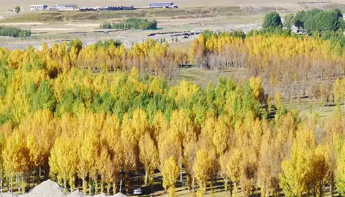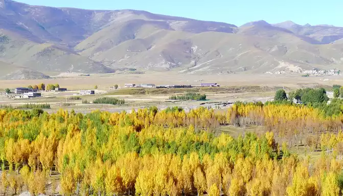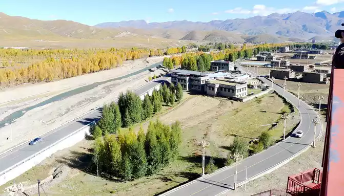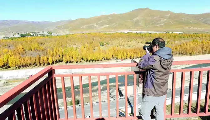 The observation deck is a steel frame platform more than ten meters high, just on the side of the road, and is open to the public for free. Climbing to the high platform and looking out, across the river is the "10,000 acres of river beach green poplar forest" in Daocheng County, at this moment the leaves have changed color, showing a golden yellow under the blue sky, and then there are mountains, pastoral and farmhouses in the distance, and the scenery is even more beautiful. In order to improve the environment and control wind and sand, the local people of Daocheng began to plant poplar decades ago, and now it has become a forest of more than 30,000 acres.