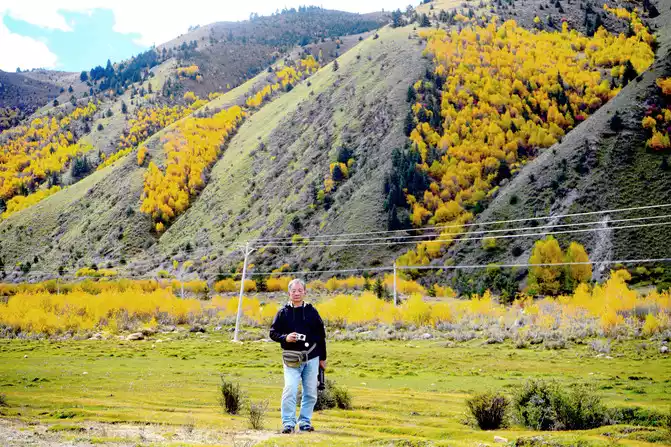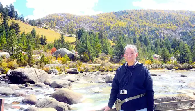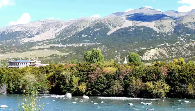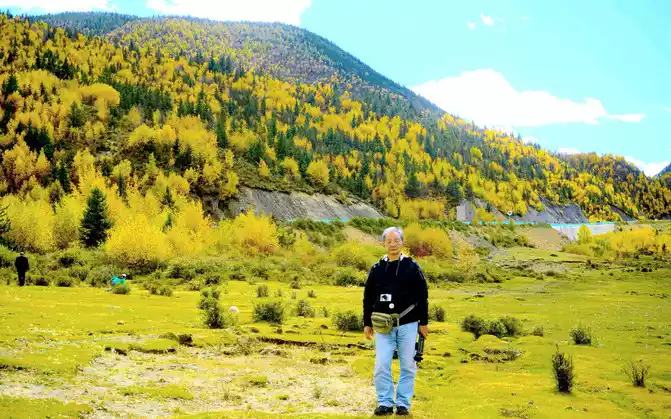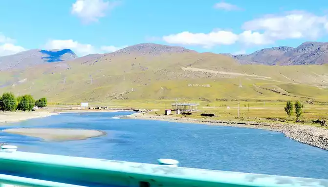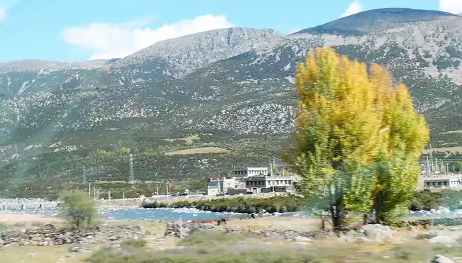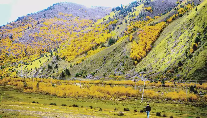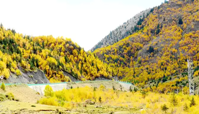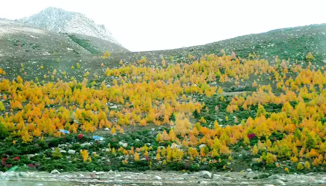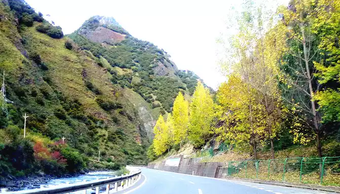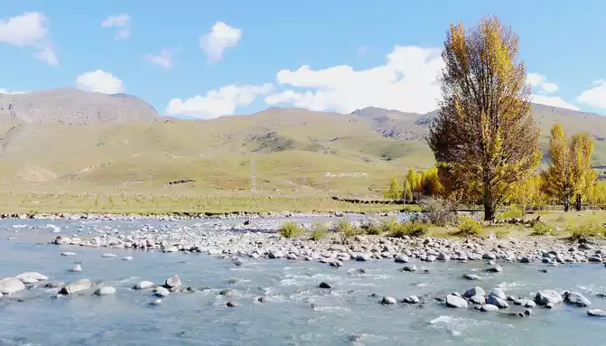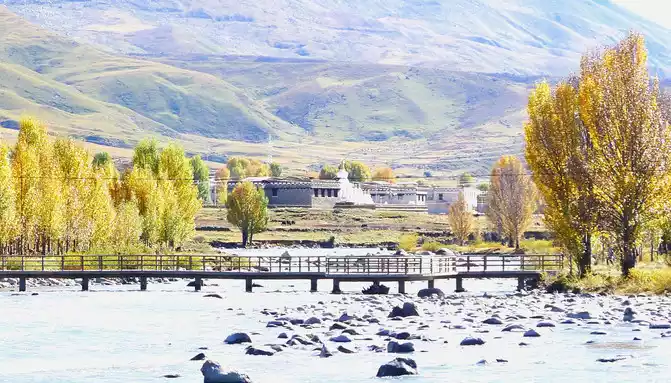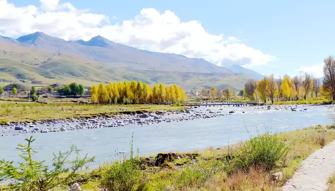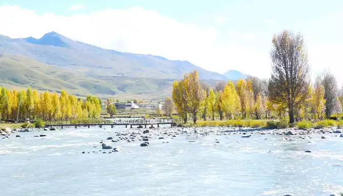 The observation deck is a steel frame platform more than ten meters high, just on the side of the road, and is open to the public for free. Climbing to the high platform and looking out, across the river is the "10,000 acres of river beach green poplar forest" in Daocheng County, at this moment the leaves have changed color, showing a golden yellow under the blue sky, and then there are mountains, pastoral and farmhouses in the distance, and the scenery is even more beautiful. In order to improve the environment and control wind and sand, the local people of Daocheng began to plant poplar decades ago, and now it has become a forest of more than 30,000 acres.
