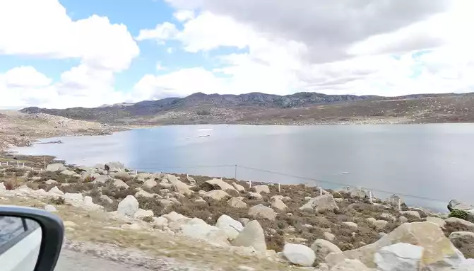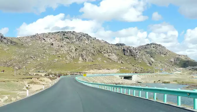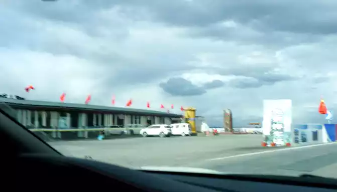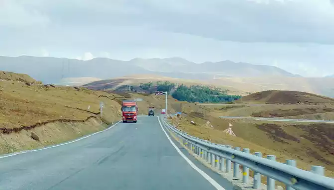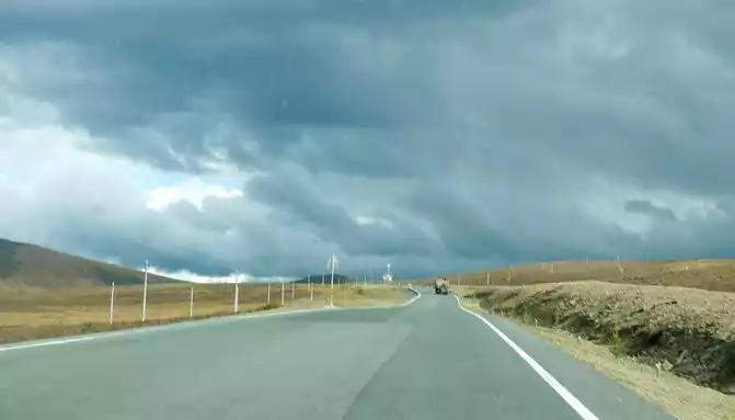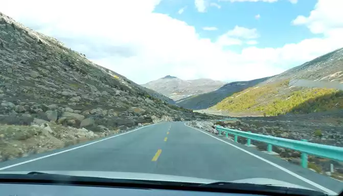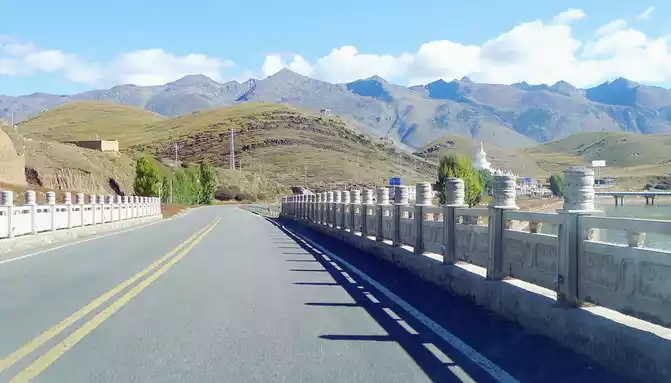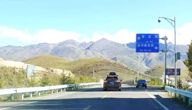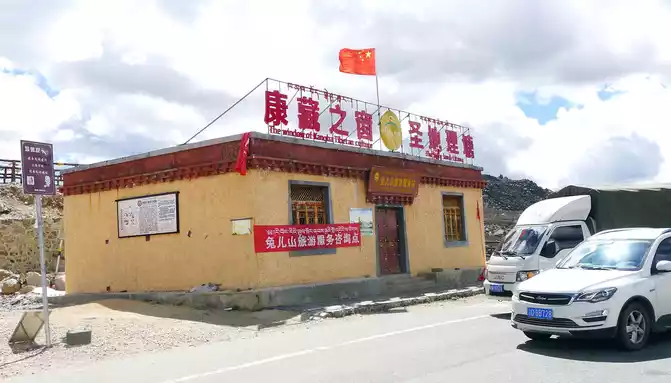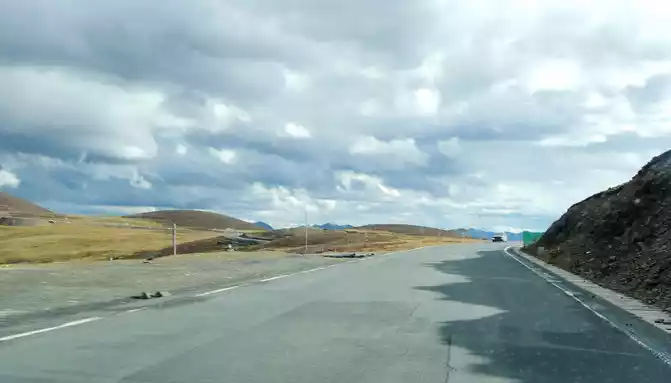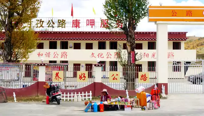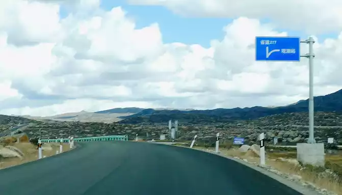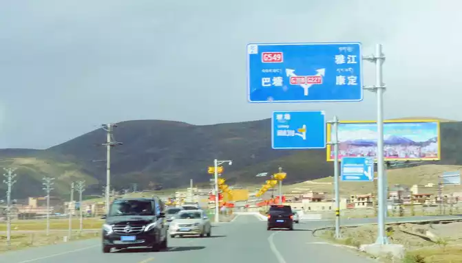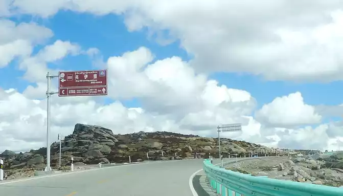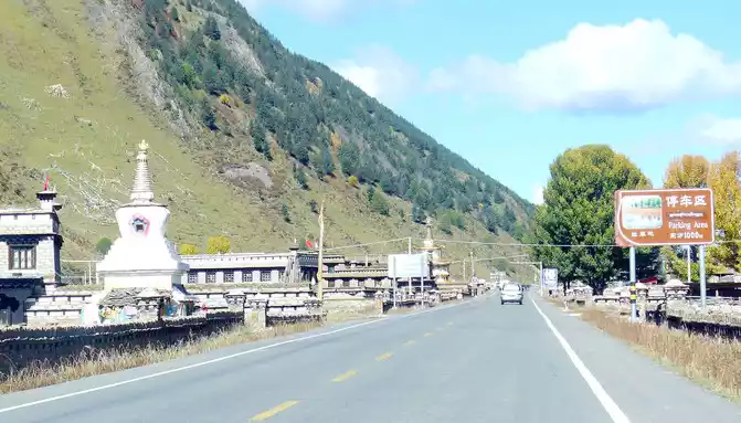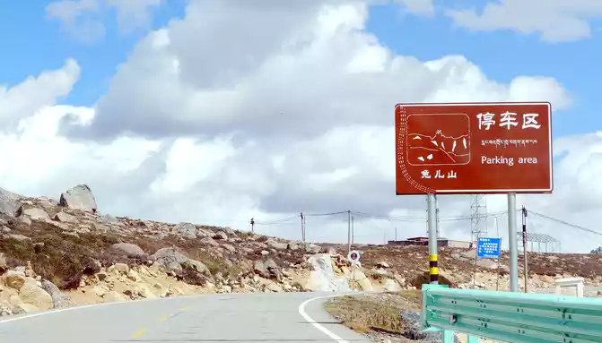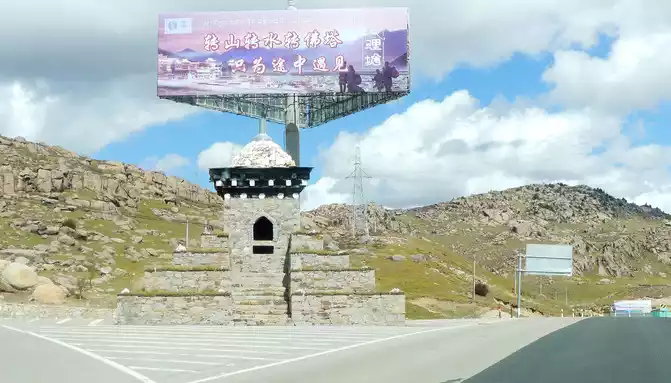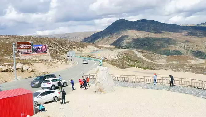 All the way down the mountain, the sky began to clear, the road was built on high mountain beams, the view was very wide, perhaps because of the high altitude, the surrounding hillsides were all bare, and not a single tree could be seen. 16:54 Passing through the "Nimagong Sacred Mountain Large Observation Deck Tourist Service Area", compared with the Kazila Mountain just now, this is a fairly well-equipped tourist service area, with a long line of houses and a fairly formal parking lot, however, we don't seem to have much scenery from the road, so we didn't park and drove straight.
