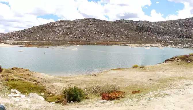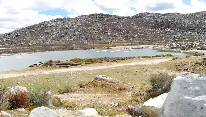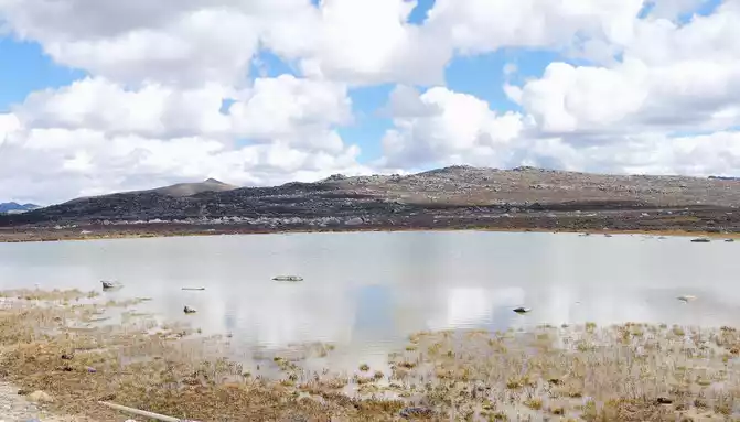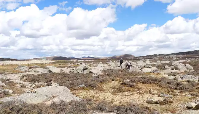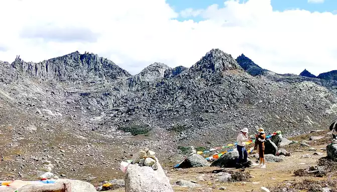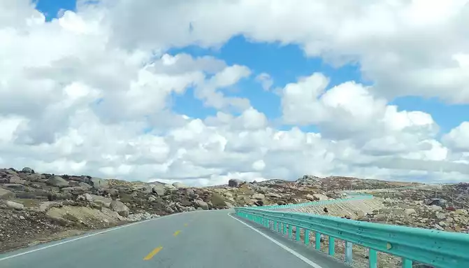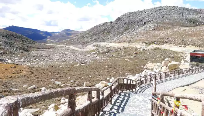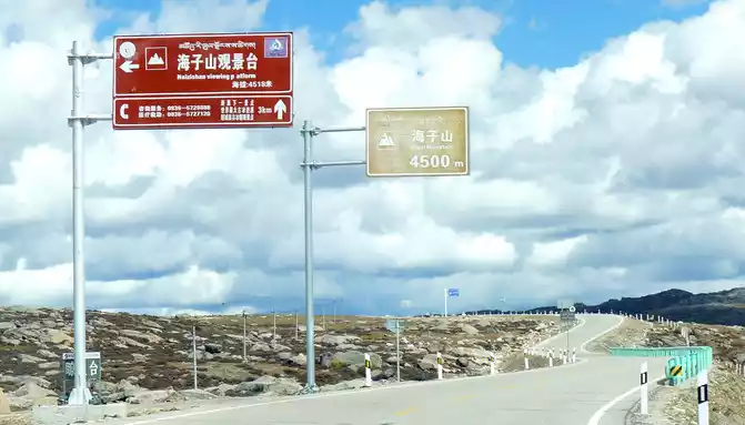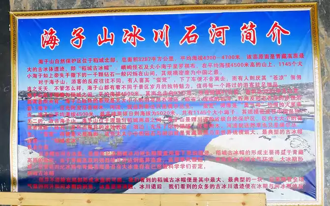 At 12:24, we set off again, and after five minutes, we drove through the three-way intersection of the airport, there was a Tibetan pagoda in the middle of the triangular intersection, turn left to "Daocheng Aden Airport", we went straight along the right side and continued to Litang. Immediately there is the "Haizishan Nature Reserve", with a total area of 3,287 square kilometers, an average altitude of 4,300-4,700 meters, jagged rocks and large and small lakes, it is the largest ancient ice body relic on the Qinghai-Tibet Plateau, known as the "Daocheng Ancient Ice Cap". Because there are 1,145 large and small lakes scattered on the top of the mountain with an average altitude of 4,500 meters, the mountain is called "Haizi Mountain". The car climbed all the way, and boulders and sea seedbits appeared on the side of the road one after another, appearing in front of our eyes.