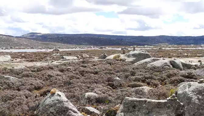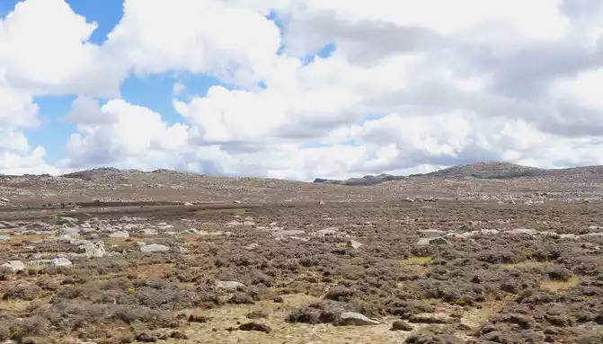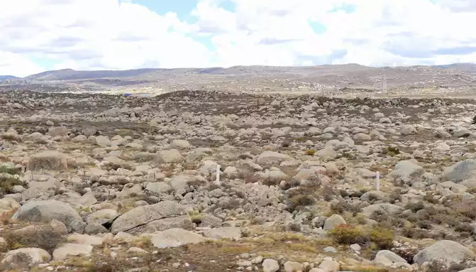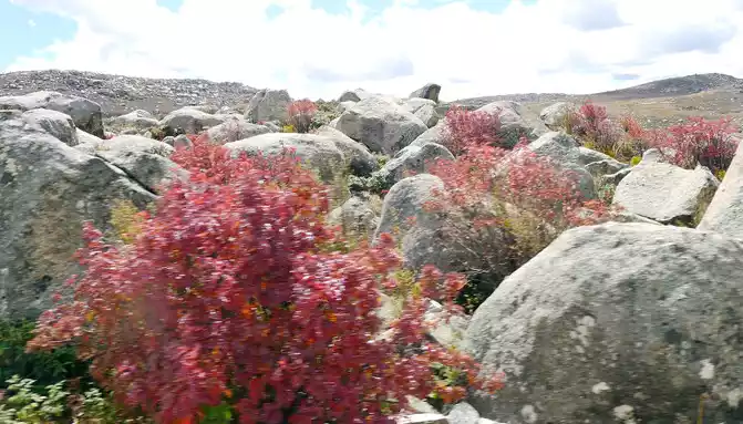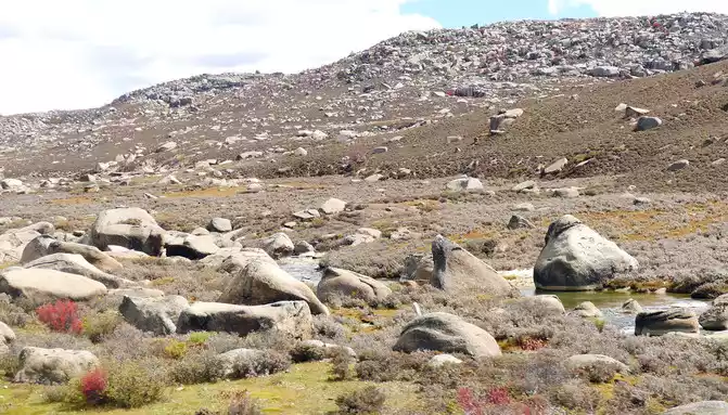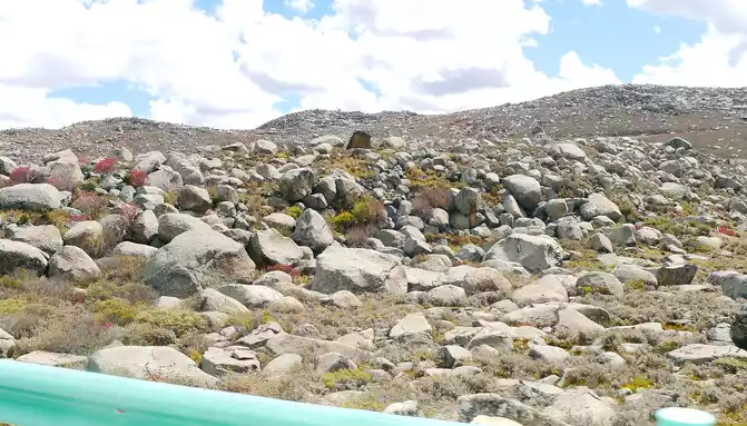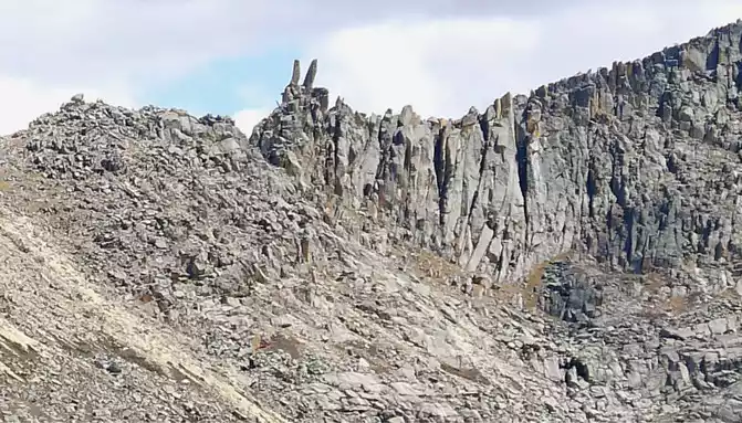 Continuing on, the remains of the ice sheet recede, and we passed a grassland where roadside signs showed that it was a "basic grassland reserve". After crossing the grassland, I started climbing the mountain again, and the landscape in front of me changed dramatically, and the desolate hillside was full of large and small broken stones. 13:16 Arrived at Rabbit Mountain, the top of the mountain pass set up a "parking service area", the mountain in front of you is all stone, the mountain seems to have been "cut by some mysterious force", the mountain is full of tall rock pillars, the rock pillars collapse, shattered, and turned into boulders, piled up all over the hillside, I suspect that these are also the work of ancient glaciers.
