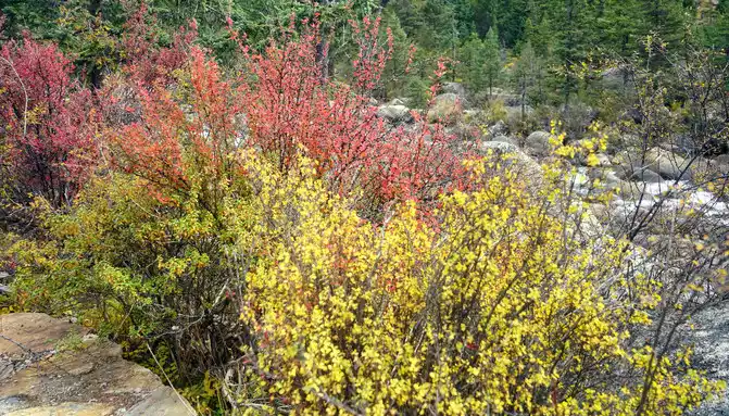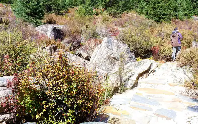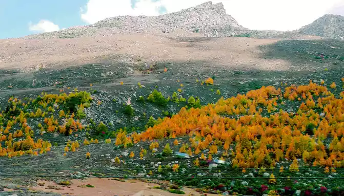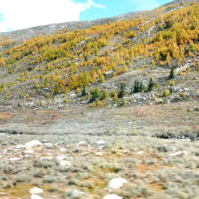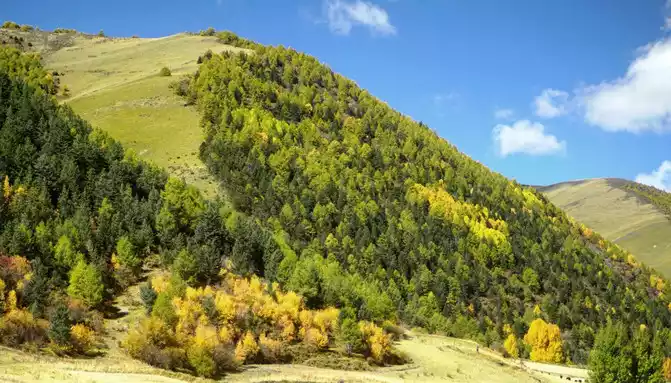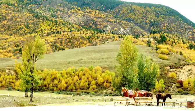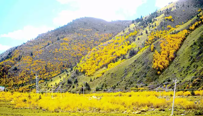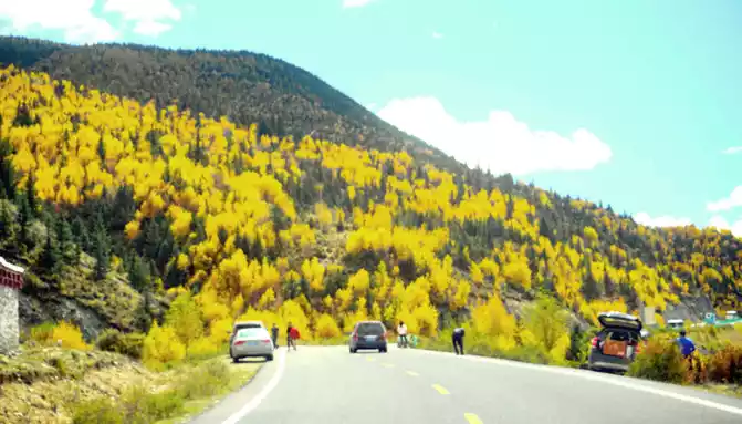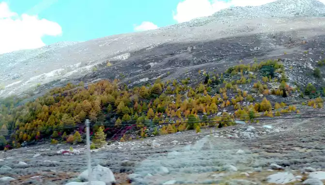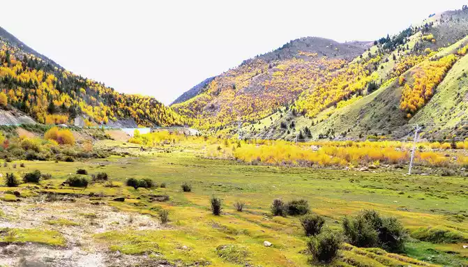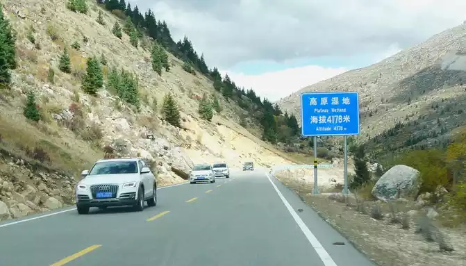 At 13:35, the car continued to move forward, the car went all the way down the mountain, trees began to appear on the hillside, and a large area of grass began to appear on the flat ground, and there was a sign on the side of the road indicating that this was a plateau wetland on Haizi Mountain, with an altitude of 4,178 meters. In the golden autumn of the plateau, the meadows, shrubs and some broad-leaved trees have changed color, but the coniferous cold cloud shirt and other tree species still remain emerald green, and various colors are mixed, compared with the desolation of Rabbit Mountain just now, the scenery here is more unique.