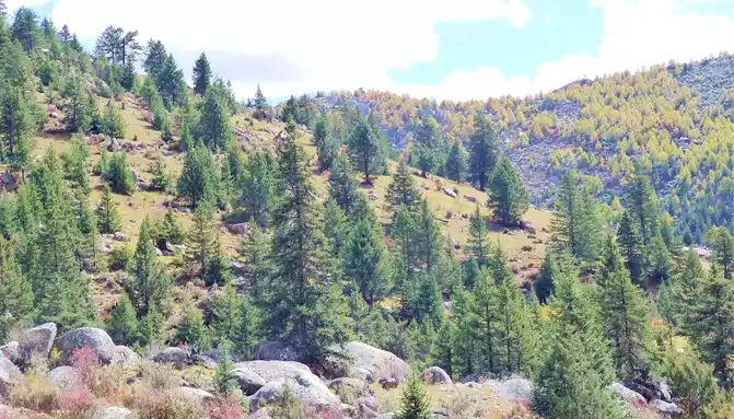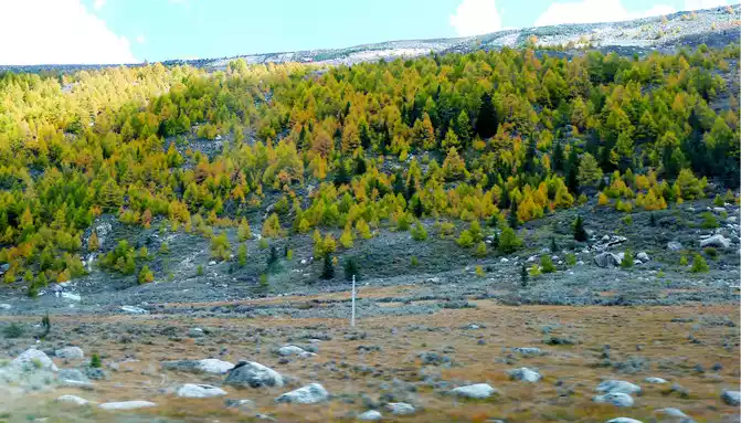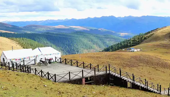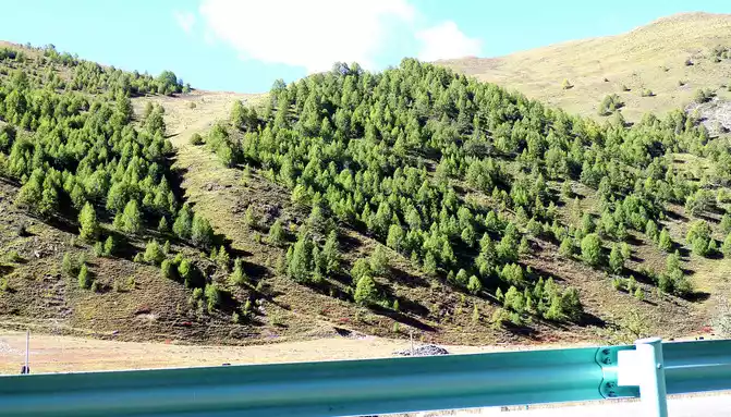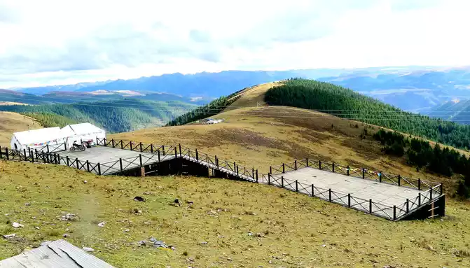 Continuing forward, the altitude gradually decreased, and large areas of trees began to appear on the hillside. 16:59 I suddenly saw a wooden observation deck on the right side of the road, so I stopped.This place is called "Orado Dongguo", the observation deck is located at the intersection of the grassland on the top of the mountain and the coniferous forest on the hillside, you can walk directly into the grassland on the top of the mountain from the observation deck, it is estimated that the scenery here should be beautiful when the spring flowers bloom, but the season is not right at this moment, we just stayed for a while, took a few photos, and then moved on.