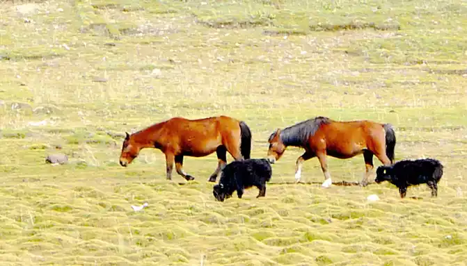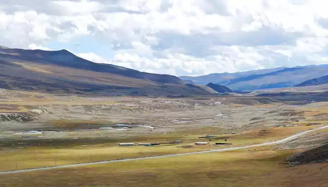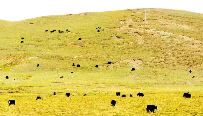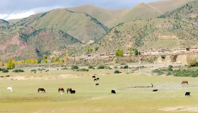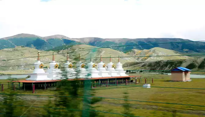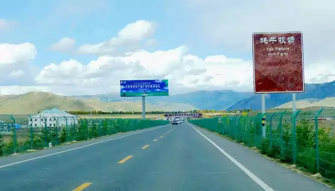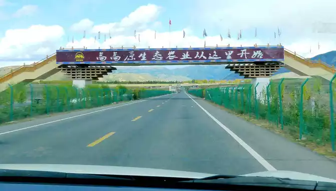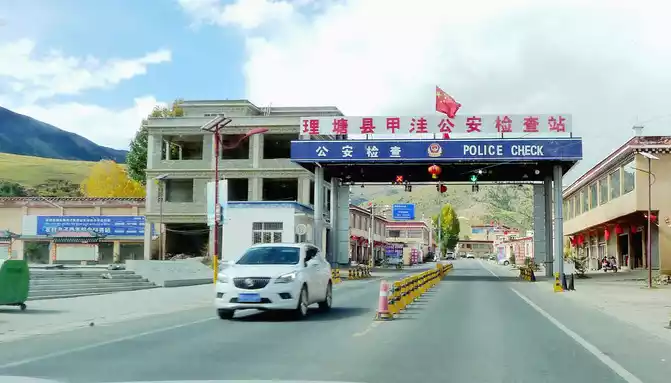 At 14:18, we boarded the bus and left, driving through vast farmland and pastures, and set up a large-character slogan in the field "Make every effort to ensure the safety of vegetables in Guangdong, Hong Kong and Macao", and there is also a slogan showing that this is the state's targeted poverty alleviation base for Tibetan areas, and it is necessary to vigorously develop plateau ecological agriculture here. At 14:25, I drove to the Tang River and saw a row of white pagodas on the grassland, and then a large grazing pasture ahead. At 14:35, it passed the Jiawa Public Security Checkpoint in Litang County, unattended.