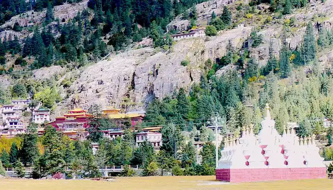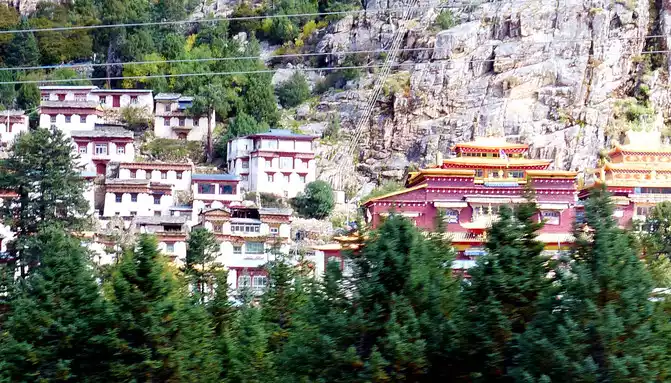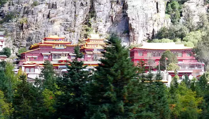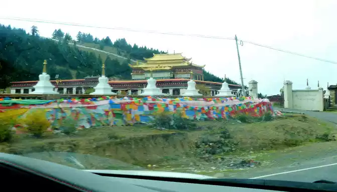 At 11:10, we drove through "Sandui Town", we did not stop and continued along National Highway G227 towards Litang. 11:13 Passing by the "Sangdui River Valley Sightseeing Platform" that is still under construction, there are two splendid temples here, one is called "Benbo Temple", which is smaller in scale, located on the top of a steep cliff, and the other is larger, called "Bengpu Temple", built at the foot of the cliff.