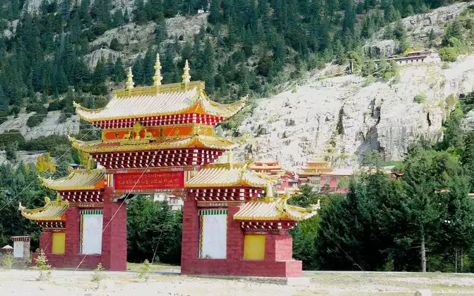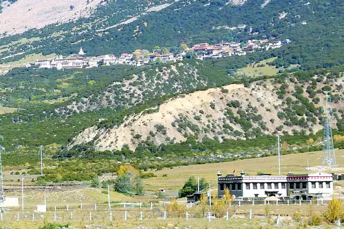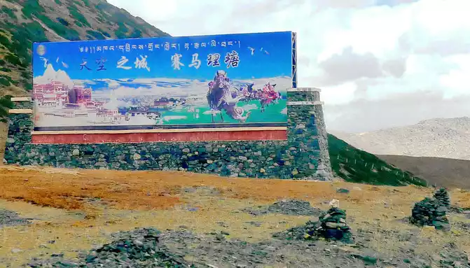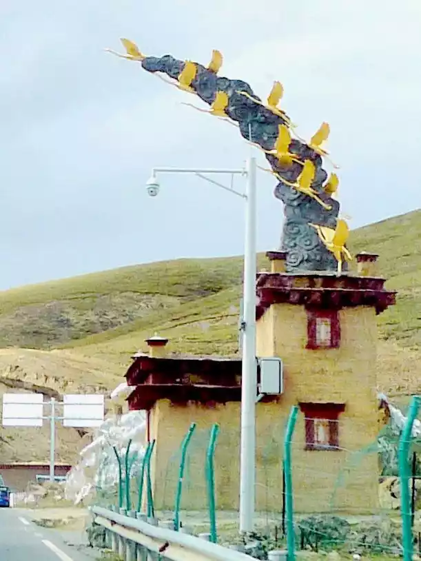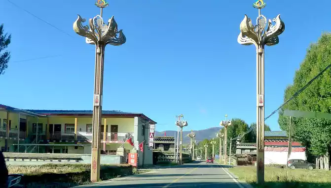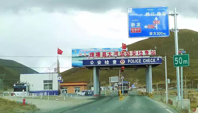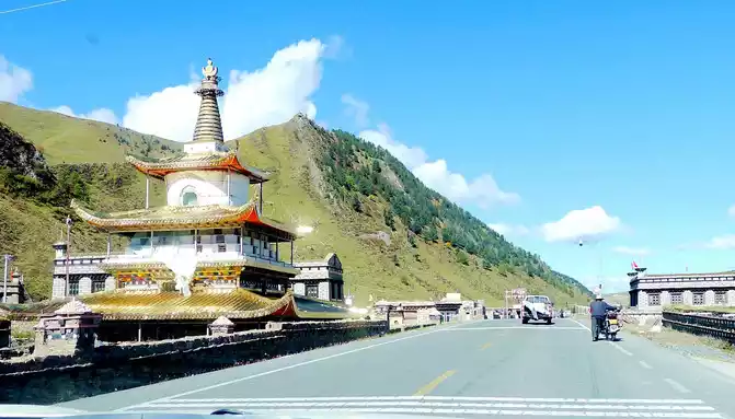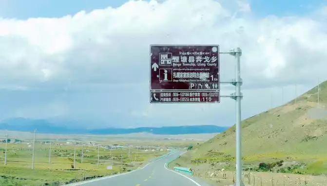 At 14:50, climb up a small mountain bag known as "Zaga Sacred Mountain", and there is a temple at the top of the mountain (4130 meters above sea level). After passing the small temple, you will go down the mountain, and below the mountain is Benge Township in Litang County, and there is a flat river and a vast pasture. At 15:05, we arrived at the three-way intersection of Litang County, from here we went straight into Litang County, we turned right, bypassed the county seat, and at 15:08 we arrived at a gate with horns and flying crane signs, passed through the door and turned right, got on National Highway G318, and drove towards Yajiang.