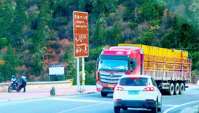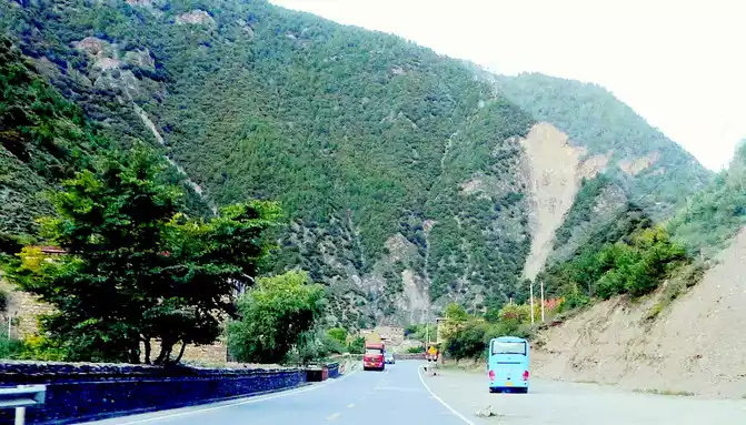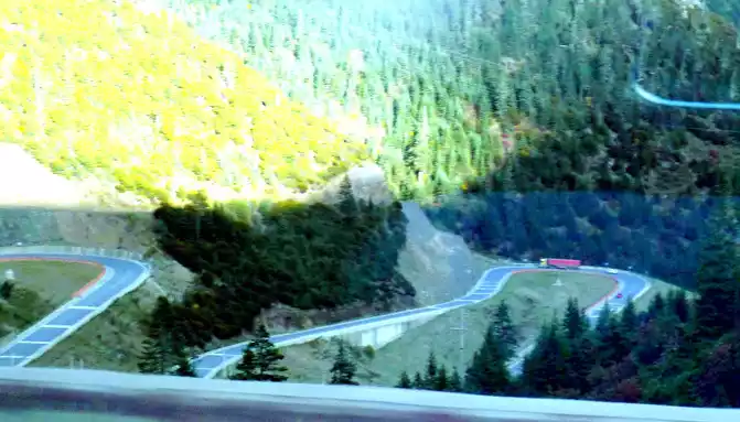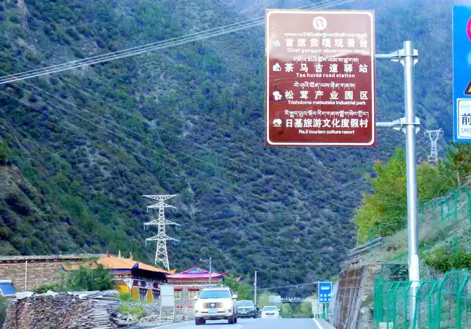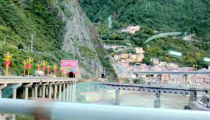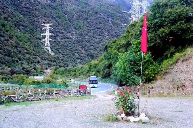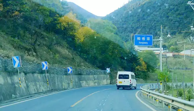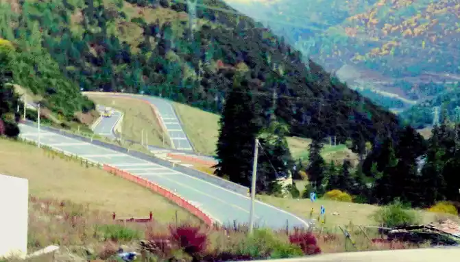 At 17:27, we drove out of the cave entrance, and immediately it was the famous "Tianlu Eighteen Bends" dangerous section on the Sichuan-Tibet Line, and after leaving the cave, we drove about 500 meters, and suddenly found that there was a "Tianlu Eighteen Bends Tourism Comprehensive Service Station", but because we were driving in the downward lane, the service station was located on the side of the upward lane, and the cars coming from the opposite side were one after another, and we missed the opportunity to enter the service station. Continuing down the mountain, at 17:33, we suddenly saw a "Tianlu 18 Bend Observation Deck" on the side of the road, however, it was also because we were going down the mountain too fast, and there happened to be a big car going up the mountain on the opposite side, and we missed the opportunity to enter the observation deck. At 17:42, we arrived at the "Xianggezong Village" at the foot of the mountain, which is 3,600 meters above sea level, and the 18-bend section of the Tianlu ends here.