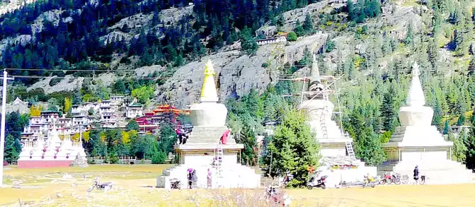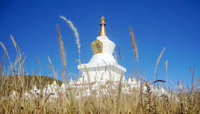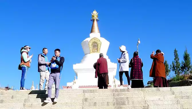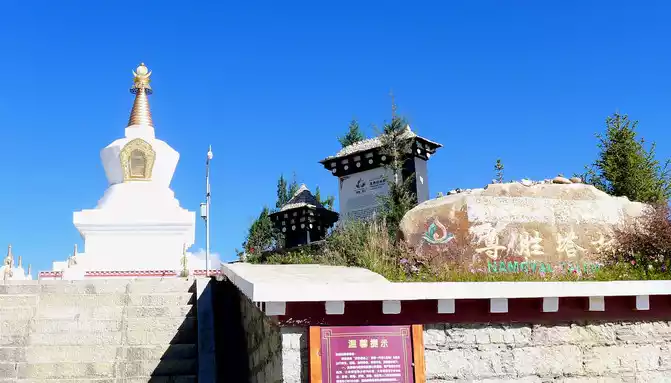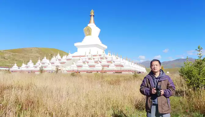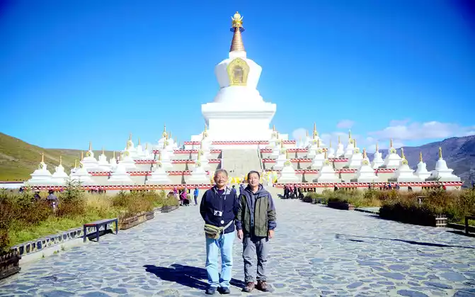 Climbing up to the high platform, I saw a white pagoda in the distance, and when I went down from the high platform, I learned from the "Daocheng County (Jinzhu Town) Tour Guide Full Map" next to the parking lot that the white pagoda is called "Zunsheng Tallinn", which is listed as the two most famous tourist attractions in Jinzhu Town along with Qingyanglin. Leaving the green poplar forest, I drove in the direction of Litang, and it didn't take long to see the white pagoda, which is located at the head of the Daocheng Bridge, also known as the "Daocheng White Pagoda". "Zunsheng Tower" has a unique shape, it is made of a tall main tower in the middle, surrounded by many small towers, the tower is round on the top and below, the whole body is as white as jade, and there is a golden roof at the height, and the momentum is very magnificent. We arrived at the White Pagoda at 10:09, parked, sightseeed, and asked a tourist to take a group photo of the two of us.