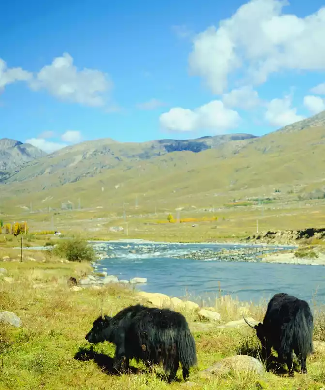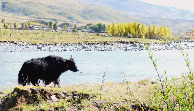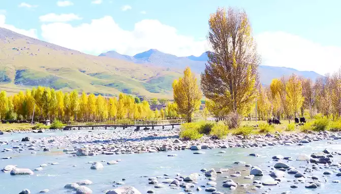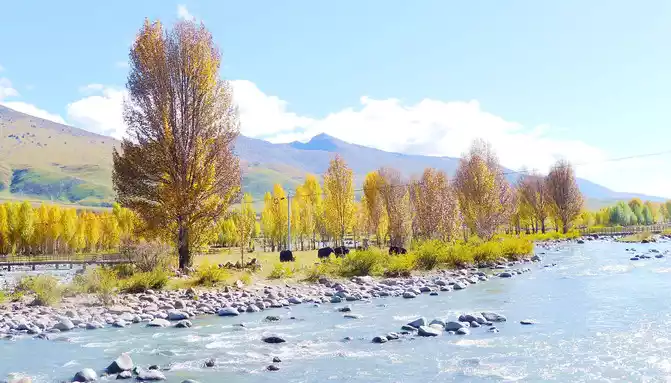 After staying for about ten minutes, there is a small river on the right side of the highway, sometimes far and sometimes near, always parallel to the national highway. It is the local mother river, which originates from "Haizi Mountain", flows through Daocheng County, and finally flows into the Jinsha River. At 10:32, drive through a wide river bay, and the road goes straight to the river, with parking lots, observation decks, and wooden plank roads set up on the riverside. There are two small islands in the center of the river, the winding trestle bridge connects the island with both sides, the riverbank and the island are densely vegetated, the autumn leaves are golden, the yaks are leisurely grazing, the beautiful scenery is comparable to the park, we stopped and stayed again.