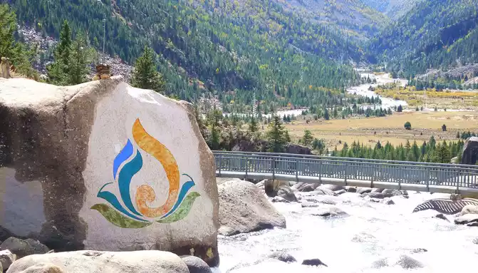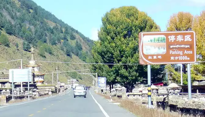 At 13:55, we drove out of a mountain pass, and a flat river appeared in front of us, autumn was strong near the pass, and the hillsides on both sides were golden. After the tour, less than 1 kilometer forward, we stopped at the "Ganzi Highway Kangxia Service Area" where we stayed three days ago, and saw the "Haizishan National Geopark" sign wall made of pebbles, and the mountain pass we just drove out of was the entrance to Haizishan Geopark.