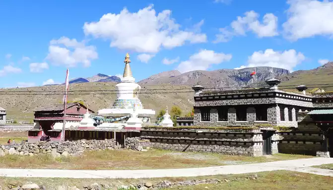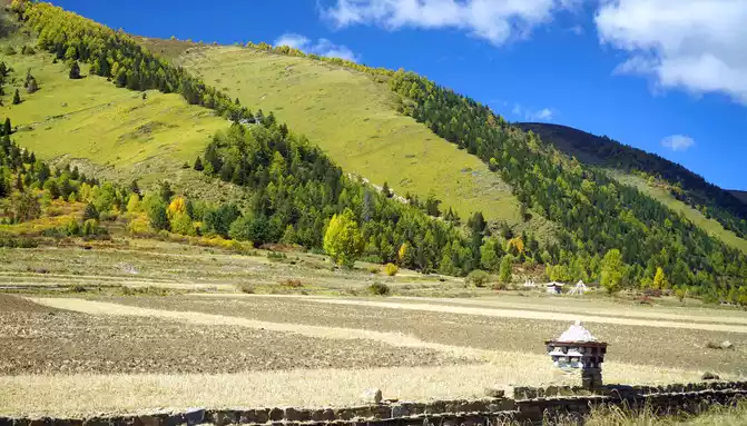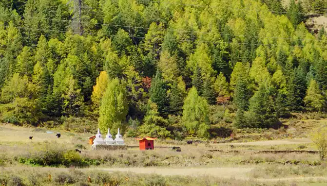 Continue to drive upstream along the small river, the scenery along the way is beautiful, there are both pagodas, Tibetan houses, small bridges and flowing water, pastures, pastures, It reminds me of the "Xinduqiao Photographer's Paradise" that has not yet been commercially developed more than ten years ago.
