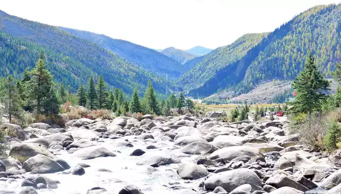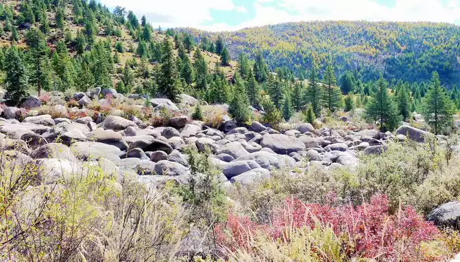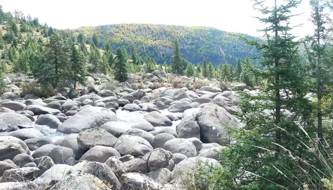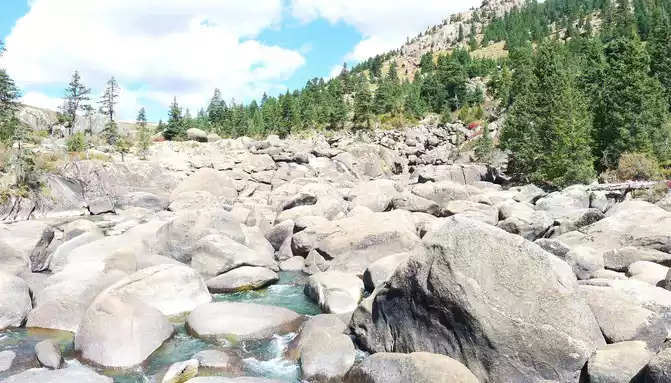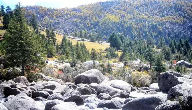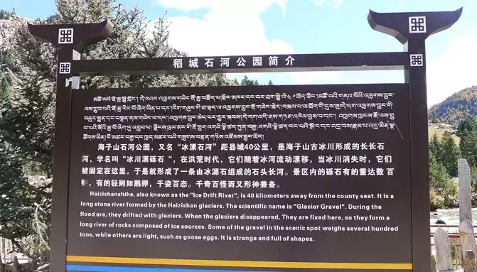 At 11:27, we arrived at the foot of "Haizi Mountain", where there is a "Shihe Park", which is open for free, and I passed by here two days ago without stopping, and today is a make-up class. The park, also known as the "Ice Drift Stone River", is 40 kilometers away from Daocheng County, which is the remains of the ancient glacier of Haizi Mountain and a long river channel filled with large and small stones in the riverbed.These stones are called "glacial drift gravel", they came here with the movement and drift of glaciers in ancient times, and then the climate warmed, the glaciers disappeared, and large and small drifting stones were abandoned and fixed here, so such a long river of stones composed of ice source stones was formed in front of them. Some of the stones on the riverbed weigh 100 tons, and some are as light as goose pebbles, with thousands of postures, which can be called a spectacle.