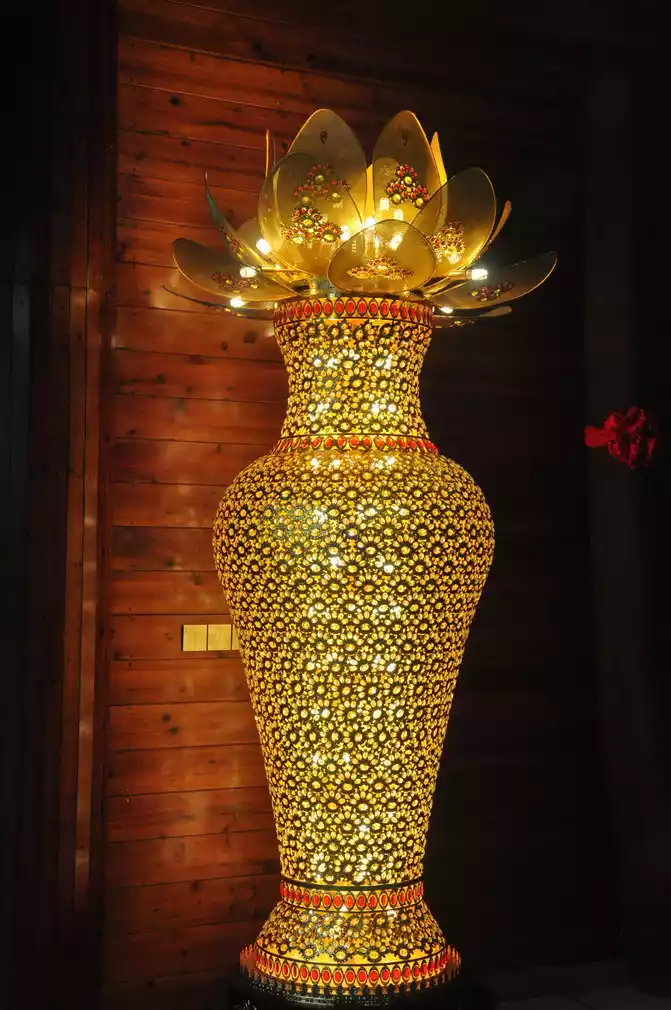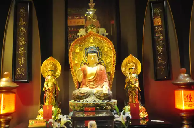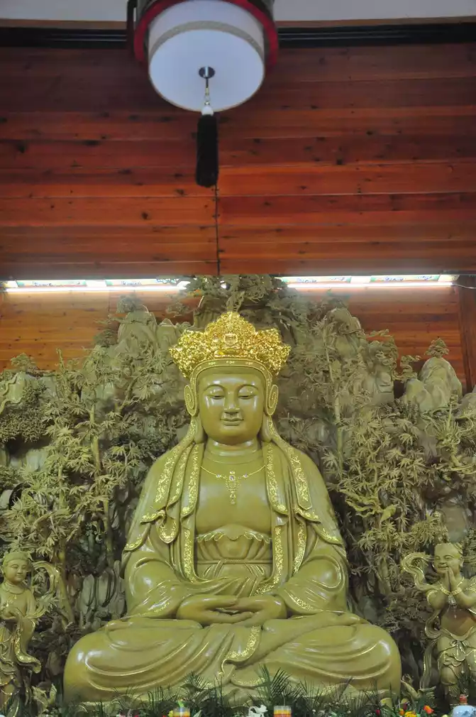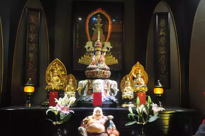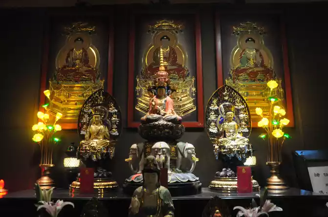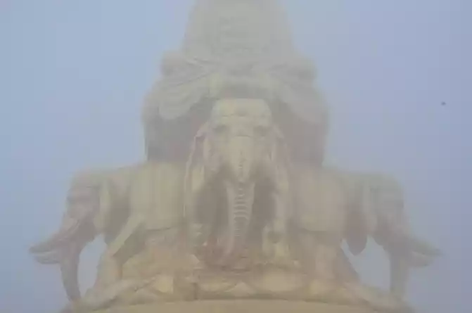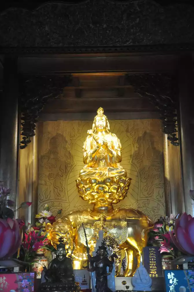 Another highlight of the Golden Dome is the Golden Statue of the Ten Directions of Puxian, which was completed on June 18, 2006, with a height of 48 meters, a weight of more than 600 tons, and a construction area of 1,000 square meters, which is currently the largest and tallest statue of the Ten Directions Puxian in the world. The construction area of the Golden Hall and the Copper Hall is 1,800 square meters. The Golden Hall has a copper-faced gilt roof, which is currently the largest golden hall in China. The worship avenue, 18 meters wide, 108 meters long, 10 levels, is guarded by 10 pairs of elephants, which not only reflects the spirit and characteristics of the practice of universal sages, but also contains the direction and way to guide all living beings to worship the Buddha. The 48-meter-high Golden Buddha Pass represents Amitabha's 48 wishes. The "Ten Directions" symbolizes the ten major vows of the universal sages, and the other symbolizes the ten directions of east, south, west, north, southeast, southwest, northeast, northwest, upper and lower directions in Buddhism, which means that the boundless vows of the universal sages can fulfill the Buddhas and sentient beings of the ten directions. The ten heads of Puxian are divided into three layers, with different demeanors, representing the ten mentalities of the world.