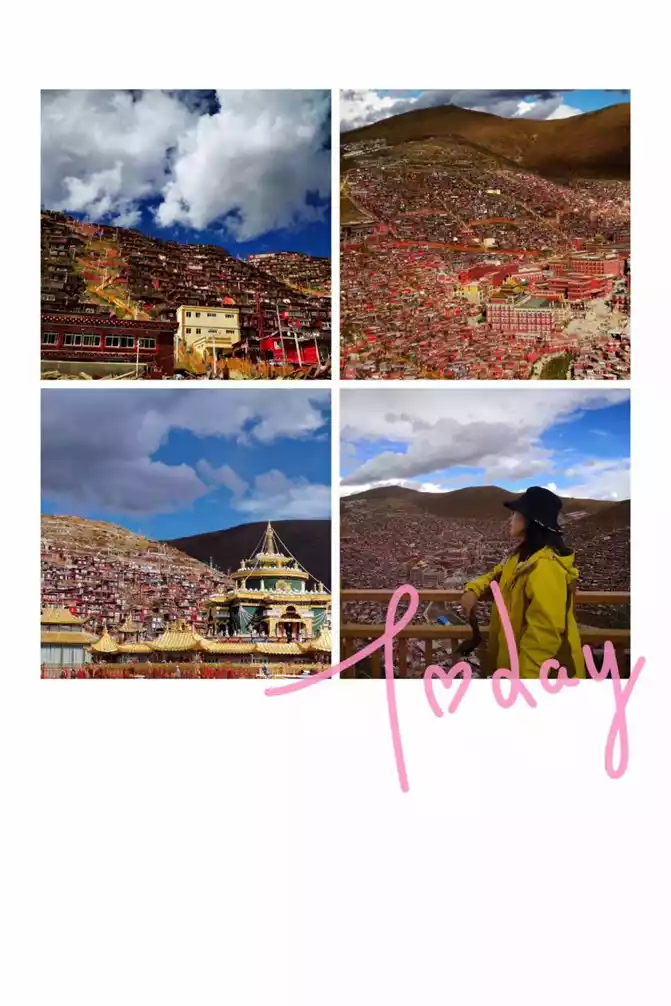 My husband and I, Long Quan, Fangfang, and Da Mao, climbed pantingly along the plank road in the middle of the red house to the top of the mountain, without using oxygen, and rested four or five times for half an hour. Climbing to the top of the mountain, the sun was shining, my hair was sweaty, and the down jacket I brought out was not useful. Many nuns and lamas in red clothes go in and out of the little red house, and basically everyone is chanting sutras with a small speaker. They don't allow people to take pictures or talk to tourists, maybe they don't want us outsiders to disturb their retreat. Lay people like us can only walk quietly and take a look, and when we speak loudly, we feel that it is blasphemy against them. There are many tourists and believers in the prayer wheel in the mandala, and there are also people outside who are doing worship one after another on the wooden board, and we followed the people who turned the prayer wheel three times, feeling the power of this faith, and we couldn't help but tear our eyes.