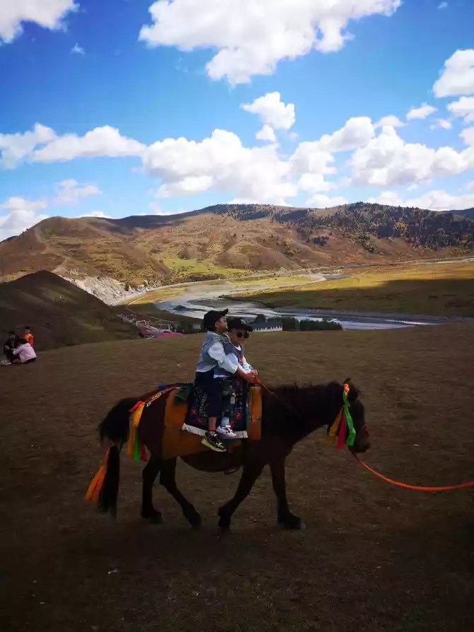 When we arrived in Tagong, it was 2 o'clock in the afternoon, and there were no attractions arranged today, the focus was on the road, and we could only feast our eyes in the car, but we still stopped in Tagong. Tagong Grassland is next to the road, there is a Tagong Temple at the door, there are many Tibetans leading horses, carrying one person to the top of the slope for 100 yuan, in fact, it takes less than 10 minutes to walk up the top of the slope along the plank road, but everyone has hardly ever ridden a horse, and in order to find an entertainment program for the two children, we bargained to 80 yuan, and all rode up the slope. When he went to the top of the slope to take pictures, Ermao didn't get off his horse, he said it was so fun.