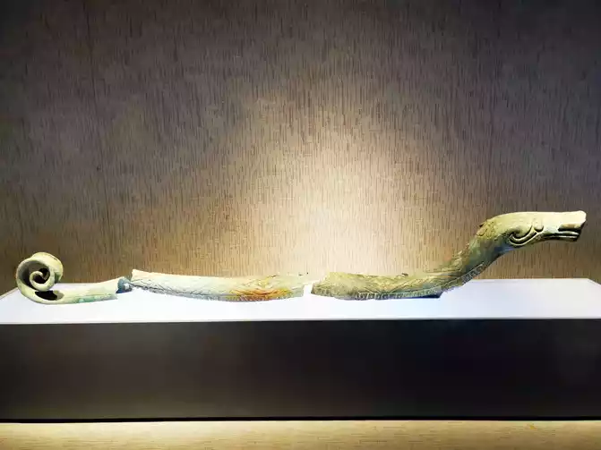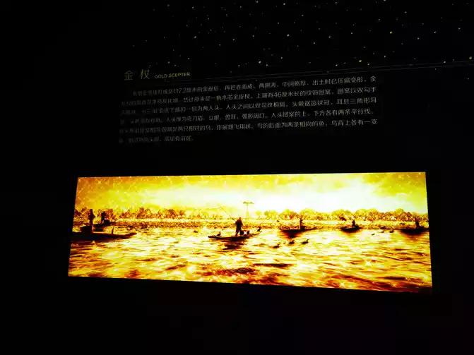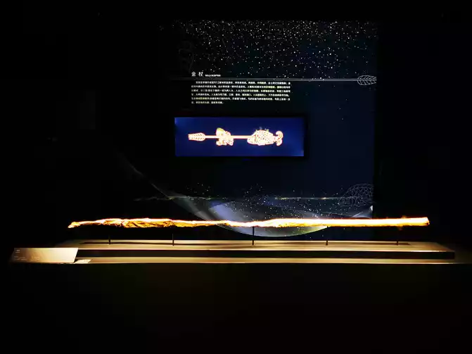 and golden staff are the largest, heaviest and rare treasures representing royal power among the gold vessels of the Shang Dynasty found in China so far, and it is also the earliest golden staff found in the world so far. 1.42 meters long, the wood in the center has decayed, leaving only a thin layer of gold clothing, the gold of the supreme and the scepter of the supreme are combined, representing divine power and royal power, one end of the golden staff is carved with a 46-centimeter-long pattern, drawing a picture of an arrow penetrating a bird into the head of a fish, and there are two heads wearing a five-foot crown, the fish can dive deep to the bottom of the water, and the bird can fly to the sky, which symbolizes that the power of the King of Shu has the magical power of heaven and earth, some experts believe that the person wearing the five-toothed high crown should be the Shu ancestor silkworm bush, he handed over the golden staff representing the king of Shu to the fish and duck, and the image of the feather arrow running through the bird and the head of the fish on the pattern is an intuitive expression of the abdication system of the throne at that time.