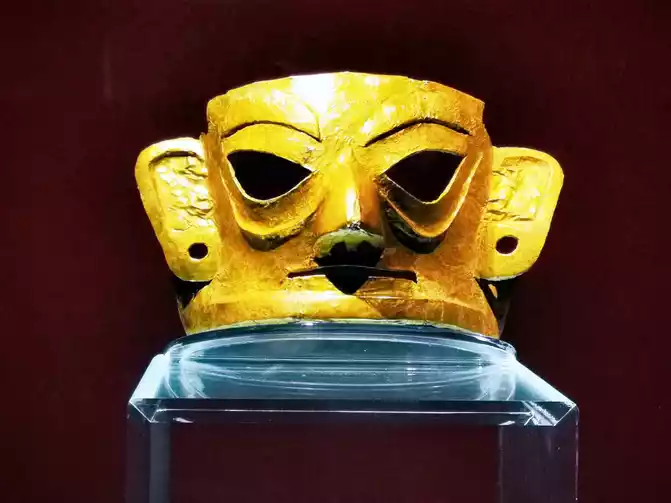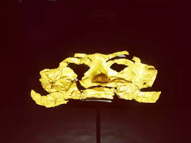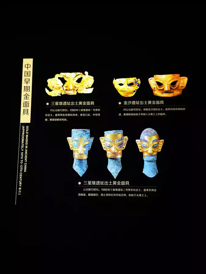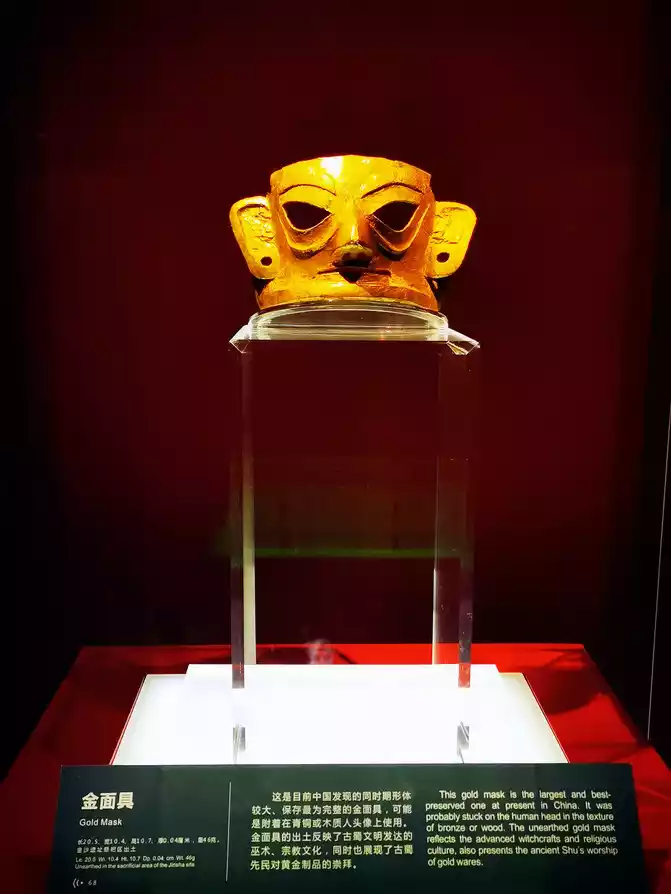 were unearthed in the sacrificial area of the Jinsha site in 2007, later than other cultural relics, and should be an important ceremonial vessel used in the Jinsha Kingdom to hold large-scale sacrificial activities, and it is the most intact and largest gold mask found in China, with a gold content of more than 80%, and its production process has reached a very high level. The overall three-dimensional face is 19.5 cm wide and 11 cm high, which is equivalent to the width of an adult male face, with a flat forehead, prominent eyebrows, large eyes, high nose bridge, wide mouth slightly open, ears outstretched, and a solemn and majestic expression, revealing the spirit of a king, which is basically the same as the bronze mask unearthed at the Sanxingdui site in terms of modeling style.