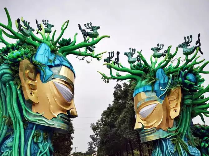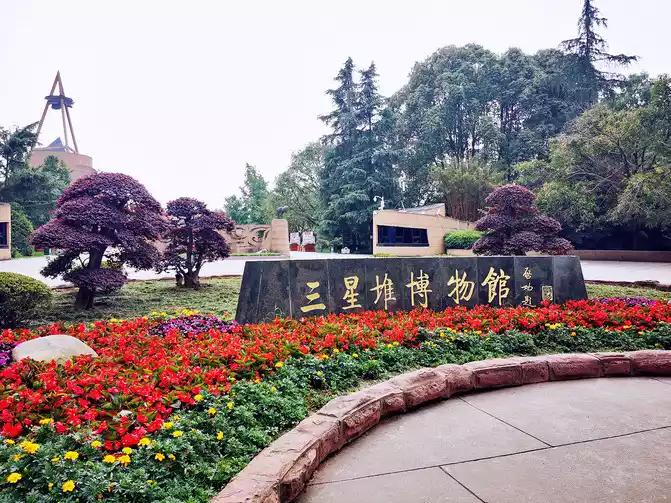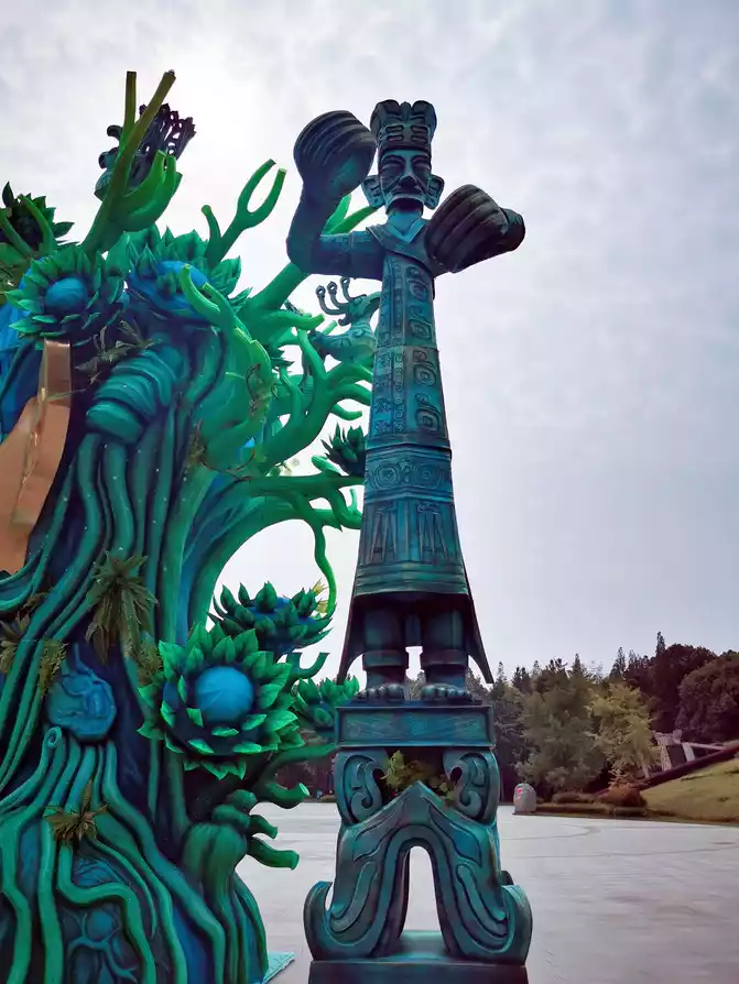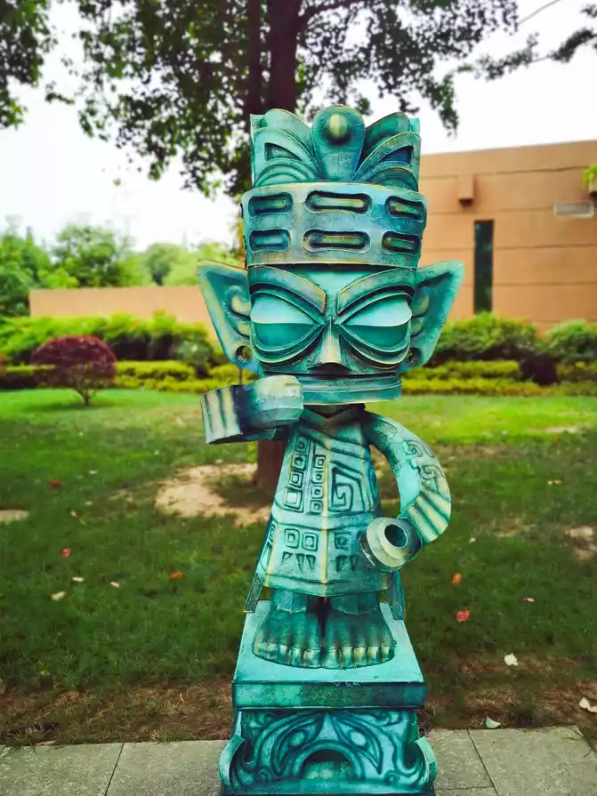 A few days ago, I was chasing CCTV's "Sleeping for 3,000 Years, Waking Up to the World" archaeological excavation live broadcast, this time I must not give up this great opportunity when I came to Chengdu, and I drove to the Sanxingdui Museum in Guanghan City with my friends. The Sanxingdui ancient site covers an area of 12 square kilometers, with a history of 5,000 to 3,000 years, and is the ancient city, ancient country, and ancient Shu cultural site with the largest scope, longest duration, and richest cultural connotation found in southwest China so far, and is an important representative of the world's bronze civilization from the 16th century BC to the 14th century BC. As the center of civilization in the upper reaches of the Yangtze River, Sanxingdui is the most mysterious star in the "starry sky" of Chinese civilization, there is no written record in all historical documents, like a silent time capsule, waiting for people to resurrect that mysterious history, the area that has been excavated is only about one thousandth, the name Sanxingdui is named by archaeologists according to the three piles of loess hills at the excavation site, which means that the mounds are shaped like three stars, and the areas that can be visited include the comprehensive hall and the bronze museum. There are many replicated cultural relics and cartoon shapes outside the museum.