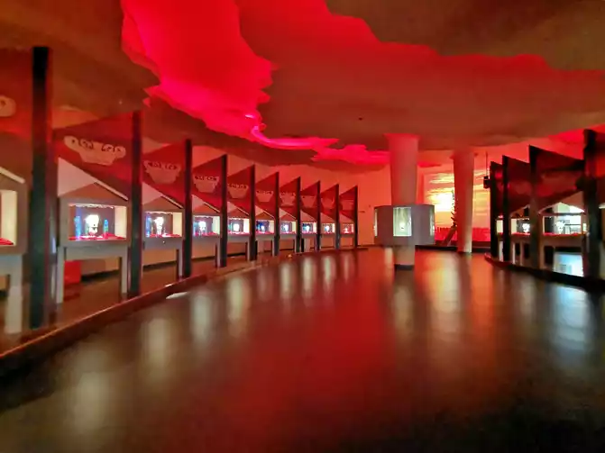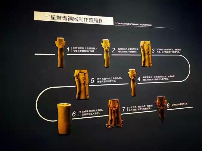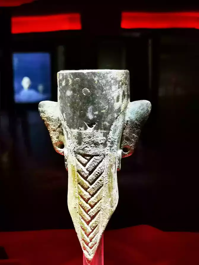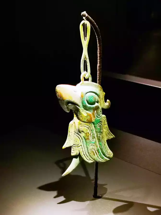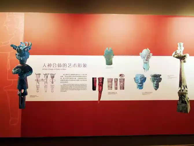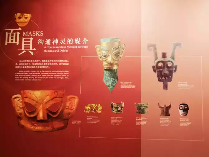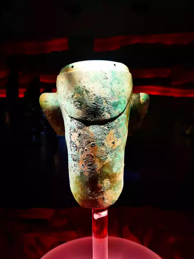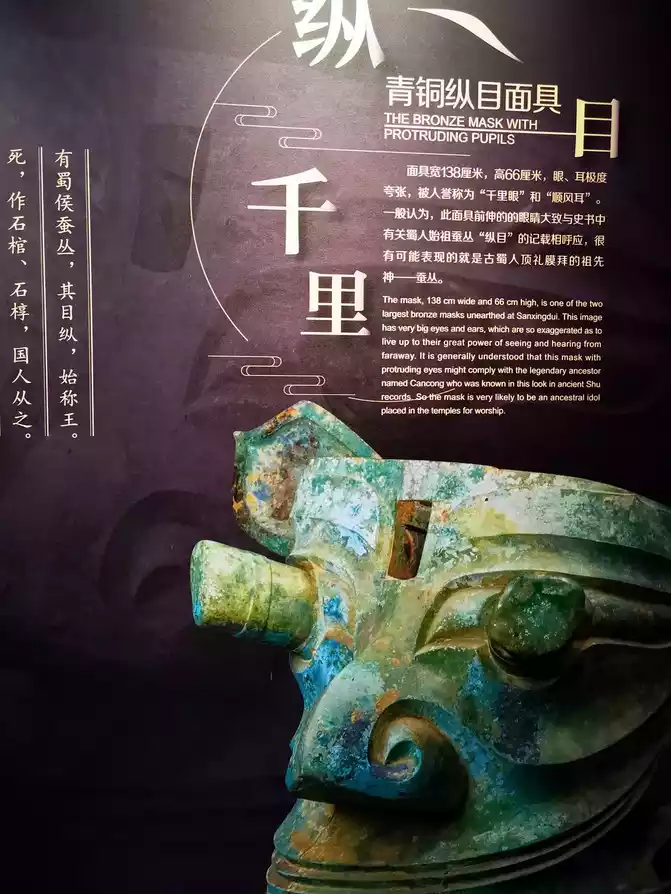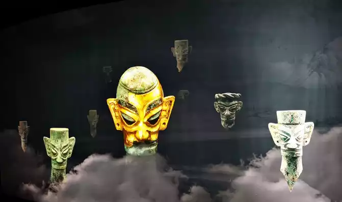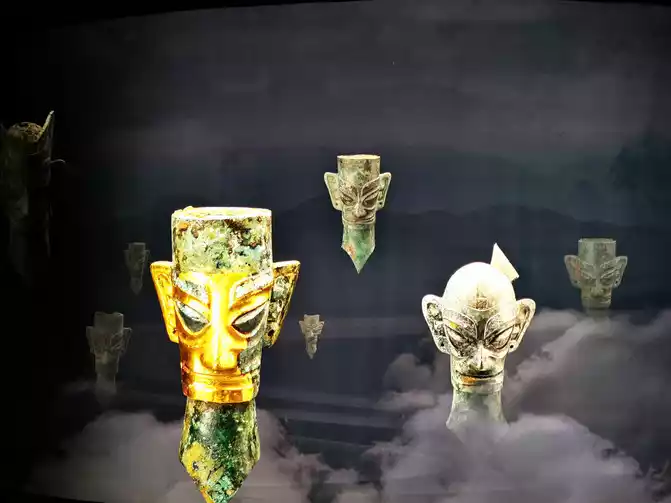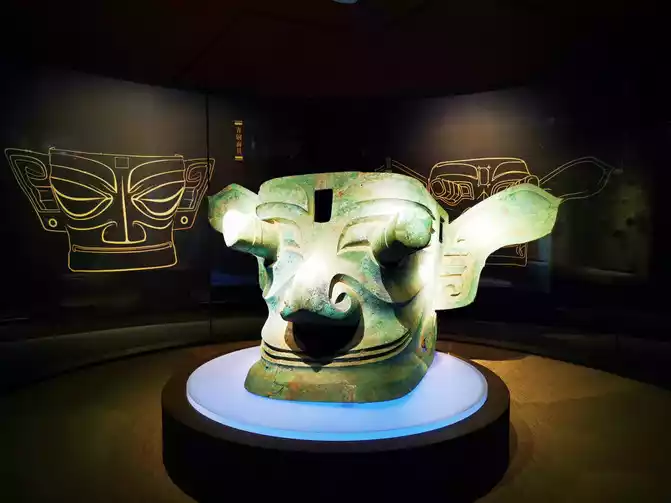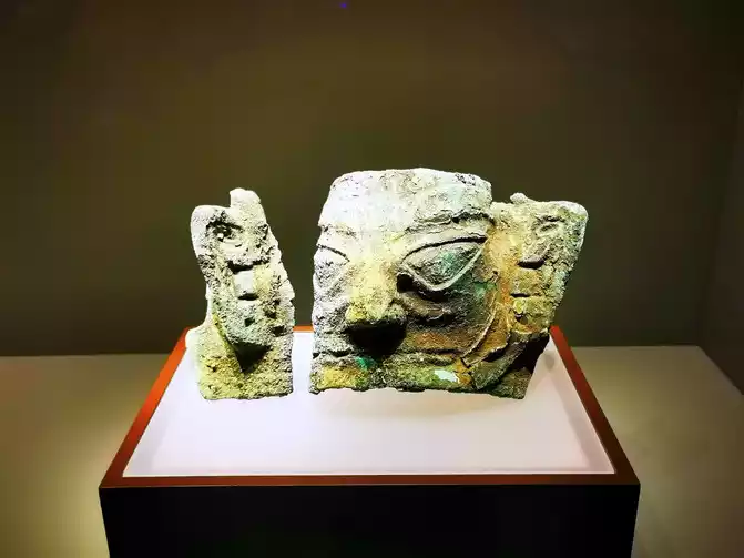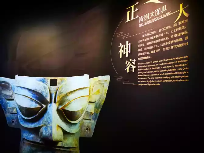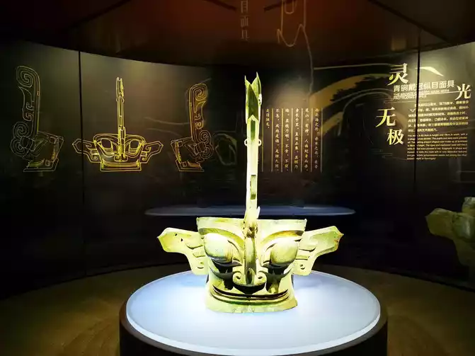 bronze of Sanxingdui can be called a magnificent spiritual epic, the spiritual life of the ancient Shu people is vividly expressed, the bronze museum takes the bronze human head bird figure as the main iconic sculpture, supplemented by a large copper relief back screen, the first exhibition hall is the mask hall, a total of more than 20 bronze human masks unearthed at the Sanxingdui site, these masks are not in line with the standard proportion of the human face "three courts and five eyes", and the exaggeration of the facial features is to widen the distance from reality and highlight its divinity. The bronze mask group represented by the longitudinal mask is one of the most distinctive and spiritual and cultural cultural relics types in Sanxingdui.