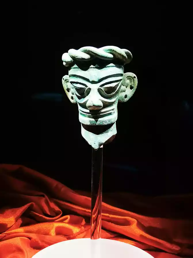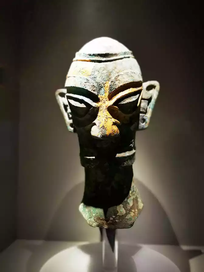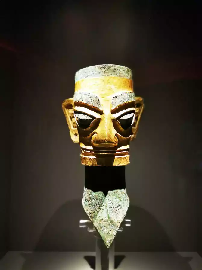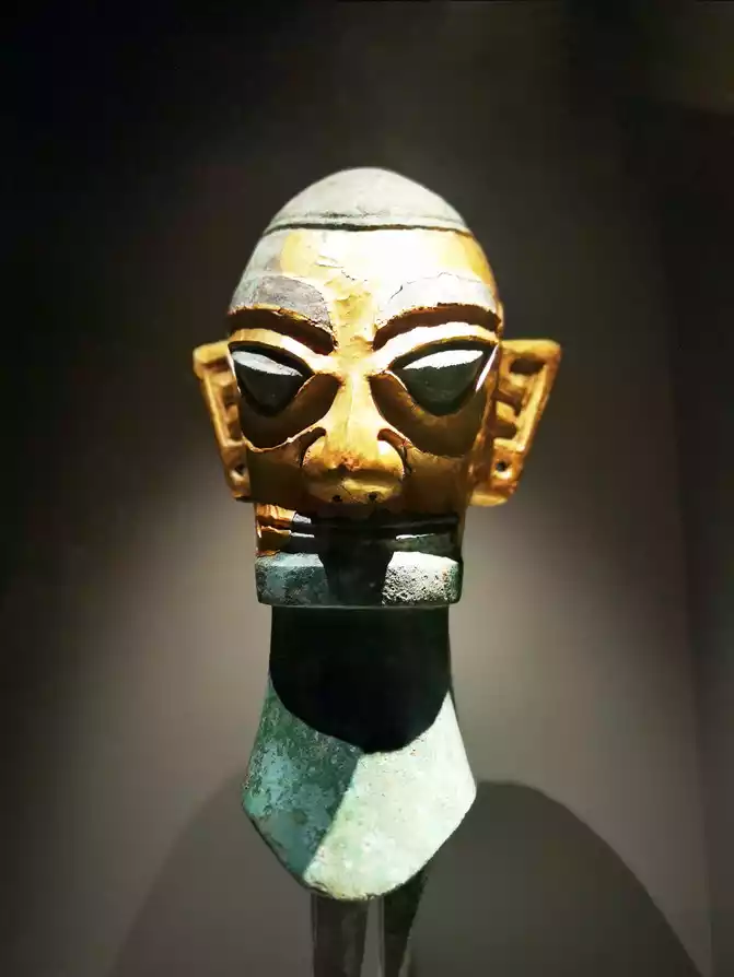 wearing a gold mask The bronze head is called the "gold-faced messenger", the gold mask is made of gold skin, according to the shape of the head, pasted on the bronze head, Sanxingdui No. 2 pit A total of 4 figures wearing gold masks have been unearthed, the size and shape are comparable to ordinary human heads, but because of the gold mask, these heads are quite noble among dozens of human heads, it is generally believed that this kind of gold-faced statue represents the highest status of the society. They hold the power of life and death, and have special skills to communicate with the gods, with golden heads and extraordinary bearings, flat-topped braids hanging behind their heads, and a strong local ethnic hairstyle style.