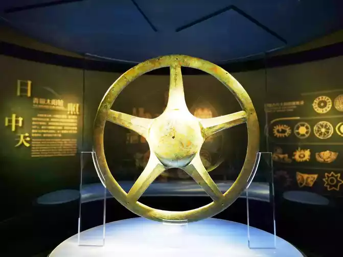 has a diameter of 84 cm, its surrounding five angles are radial, and the awn strip is connected to the peripheral halo, this shape of the artifact has never been seen in the past unearthed cultural relics, and it is generally believed by experts to be the materialization of the ancient Shu people's worship of the sun, and it is one of the most puzzling artifacts in Sanxingdui bronze ware, which is like a hot wheel and a steering wheel, could it be that the divine horse alien civilization was left behind in the country of Tianfu.