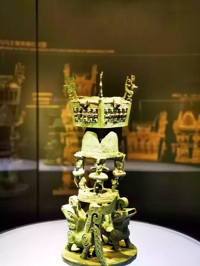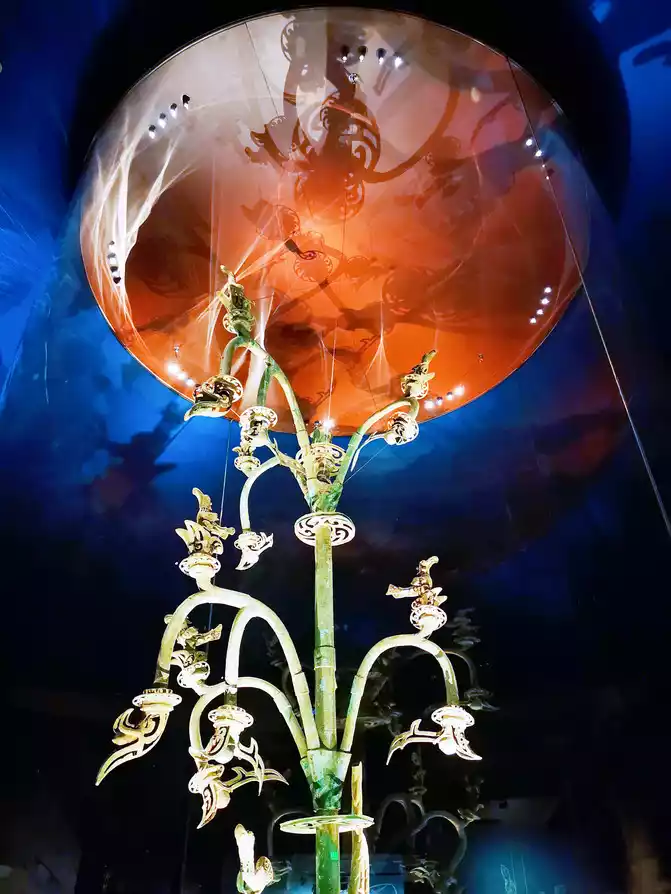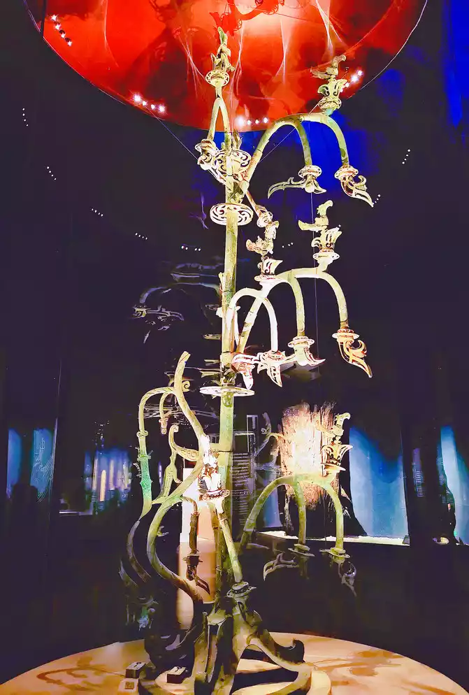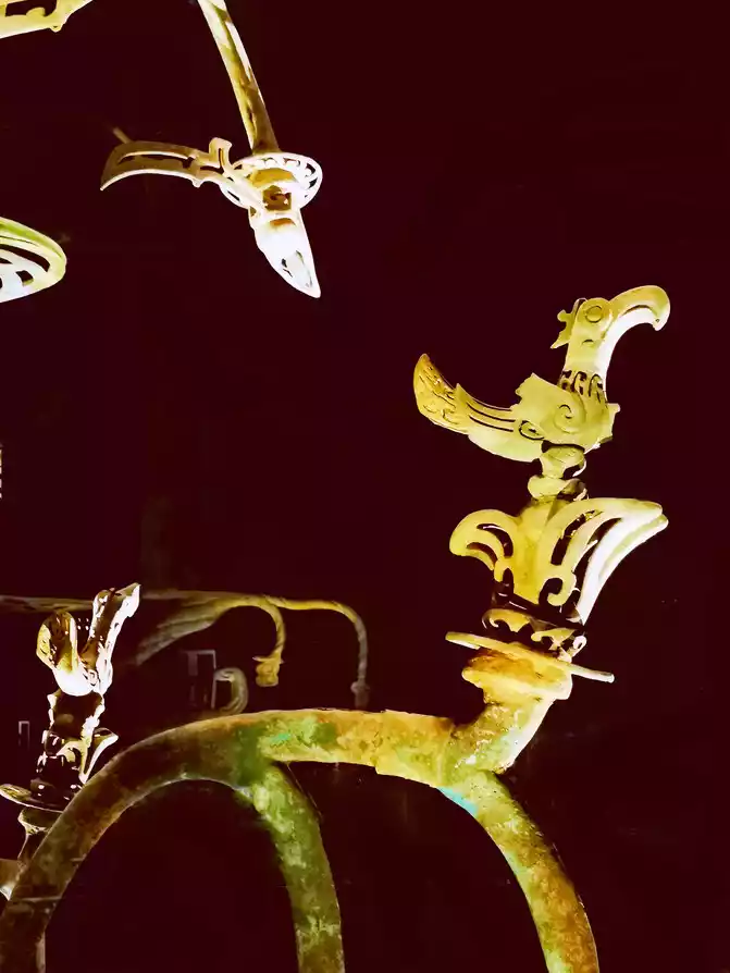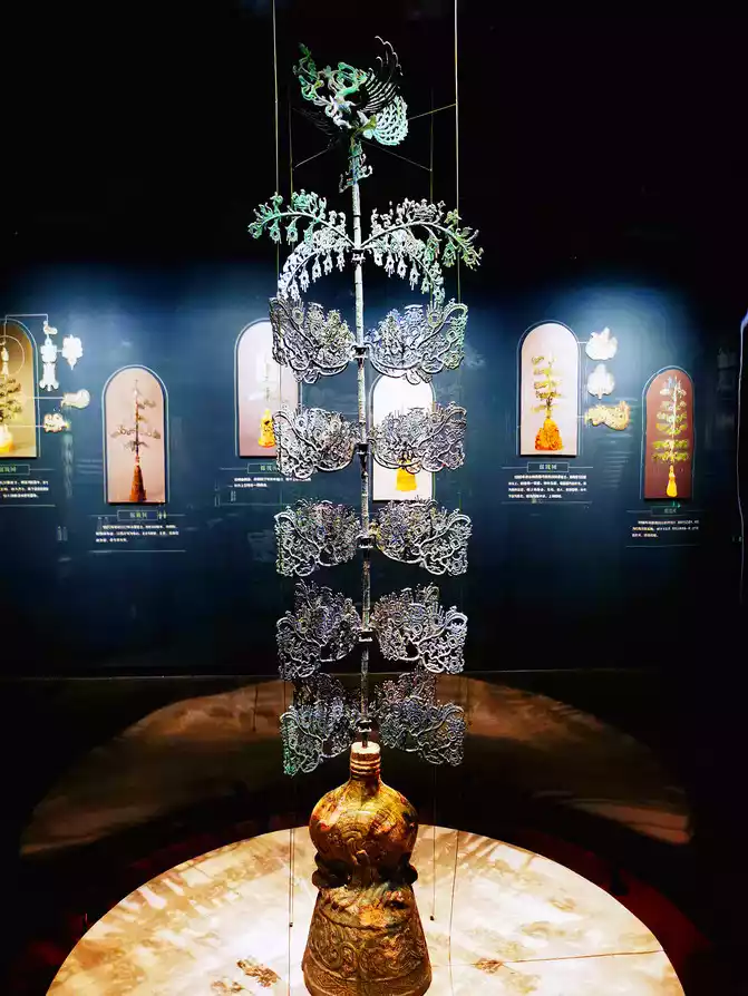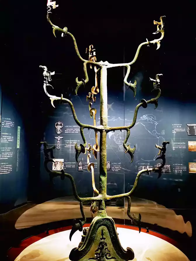 The Bronze Sacred Tree was unearthed in the No. 2 Sacrifice Pit, and a total of eight were unearthed, but only two were displayed, because the others were fragmented and could not be repaired. This fully restored bronze sacred tree is the largest, 3.95 meters high, the ancient tree under the vast galaxy connects the world, is the largest single bronze cultural relic found in the world, the shape is beautiful, named the No. 1 sacred tree, there are three layers of branches, the flowers and fruits of the branches are upturned or drooping, and there are nine sun god birds standing on the tree. The lower part of the sacred tree hangs a dragon, with the dragon's head facing down and the dragon's tail on top, which is enchanting and colorful, which has been mentioned in the "Classic of Mountains and Seas", and the image reproduces the beautiful "Ten-Day Myth" in ancient times, expressing the ancient Shu people's worship of divine birds, the sun and sacred trees, which is a rare and unique product.