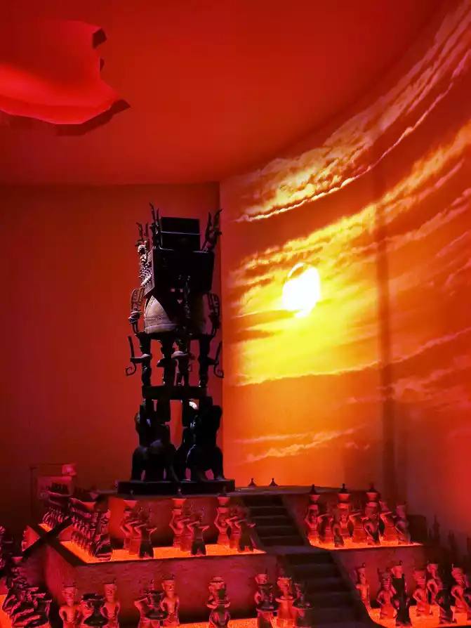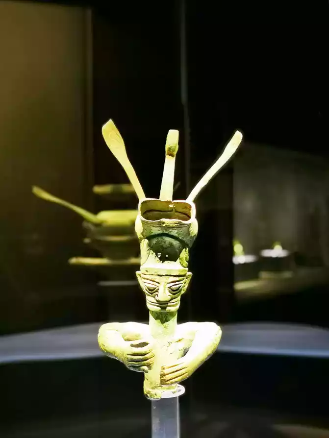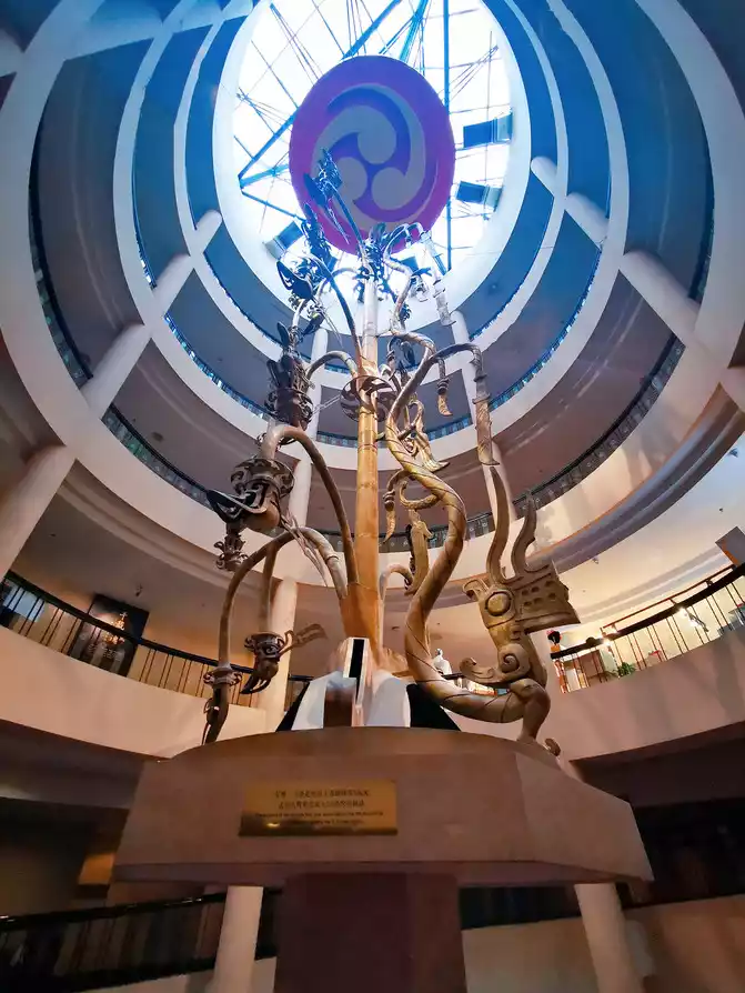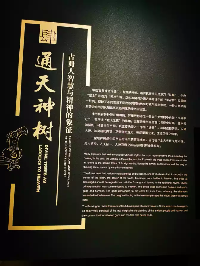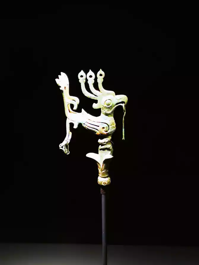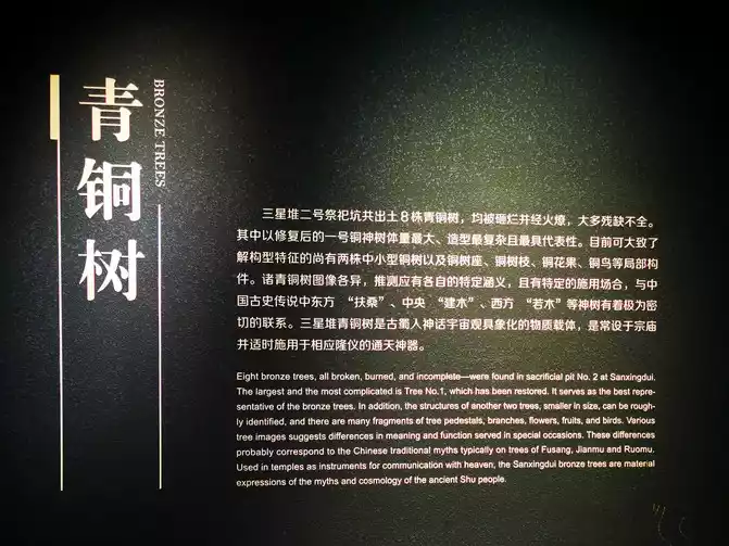The Bronze Sacred Tree was unearthed in the No. 2 Sacrifice Pit, and a total of eight were unearthed, but only two were displayed, because the others were fragmented and could not be repaired. This fully restored bronze sacred tree is the largest, 3.95 meters high, the ancient tree under the vast galaxy connects the world, is the largest single bronze cultural relic found in the world, the shape is beautiful, named the No. 1 sacred tree, there are three layers of branches, the flowers and fruits of the branches are upturned or drooping, and there are nine sun god birds standing on the tree. The lower part of the sacred tree hangs a dragon, with the dragon's head facing down and the dragon's tail on top, which is enchanting and colorful, which has been mentioned in the "Classic of Mountains and Seas", and the image reproduces the beautiful "Ten-Day Myth" in ancient times, expressing the ancient Shu people's worship of divine birds, the sun and sacred trees, which is a rare and unique product.