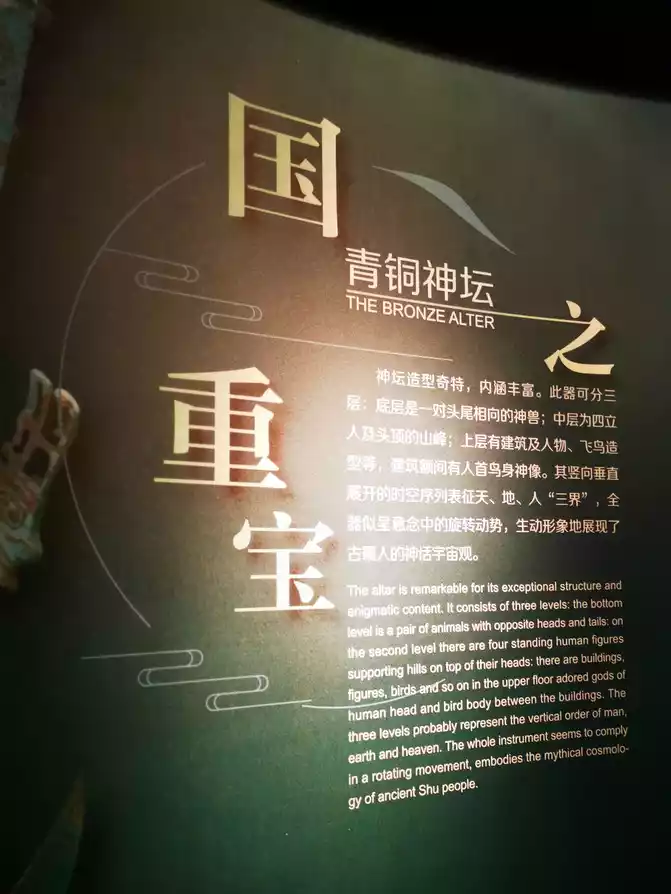 The balance of the altar is 53.3 cm, damaged by fire, divided into four layers, the bottom layer is the beast-shaped seat, is the base of the entire altar, the beast of which is the famous "divine beast under the altar", the second floor is inhabited by four Dali people, majestic and solemn, the third layer is a high mountain, the top layer is the most mysterious, it seems to be a square box. The box is hollowed out with five ancient Shu people, who may be the wizards of the ancient Shu Kingdom, all with their heads crossed, wearing long skirts for sacrifice, and their hands in the shape of rings, holding something like a bronze Dali man. The altar has a peculiar shape and is mysterious, it is presumed that it is a heavy sacrificial weapon in the ancestral temple of a certain dynasty of the ancient Shu Kingdom in Sanxingdui, it is the only bronze altar of the Shang and Zhou dynasties unearthed in China so far, and it is also one of the most representative, patterned and complex bronzes found in China so far.