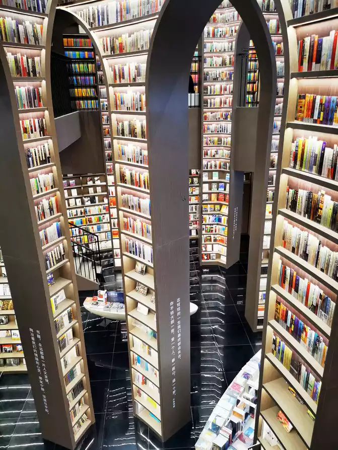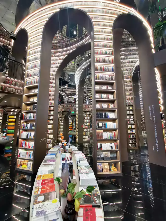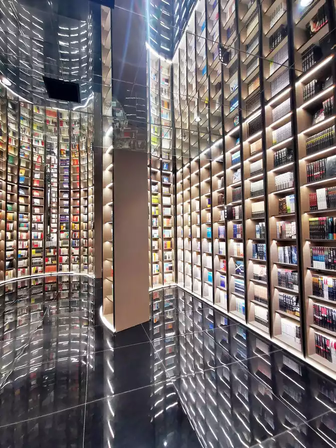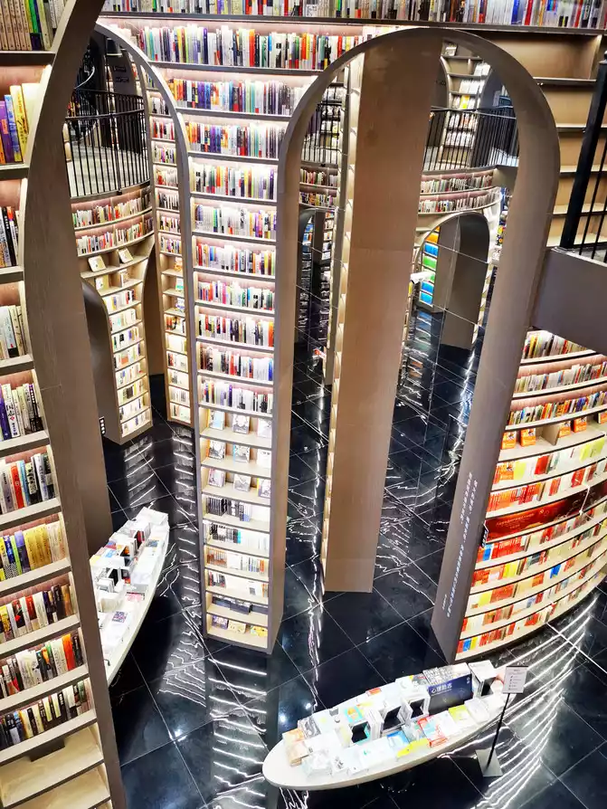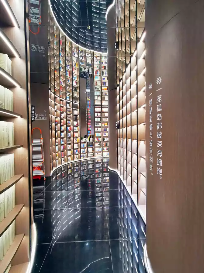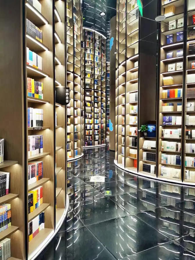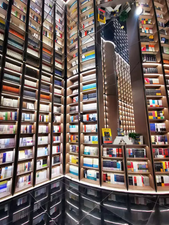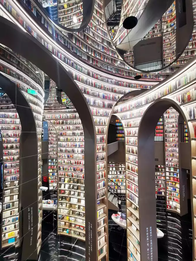 Coming to the Central Literary District, the book wall is towering and majestic, like a super "city wall", and the scattered bookshelves are like "ships" quietly moored on the lake, swaying and fluttering between the bookshelf walls, although the books at the highest position of the bookshelf are purely decorative, but it is said that there are as many as 80,000 books that readers can touch, the bookshelves stand and overlap, the 180° transparent mirror image contrast up and down, people can't distinguish between the virtual and the real, the arched bookshelves are like the towering skeleton of the future three-dimensional city, reflecting magical graphics in the mirror, Looking down from a high place in the reading corridor on the second floor, you can feel the majesty of the space, light and shadow intertwined, and the whole space presents a sense of time and space confusion, which is indeed much stronger than the look and feel of Shanghai Zhongshuge.