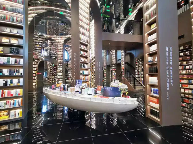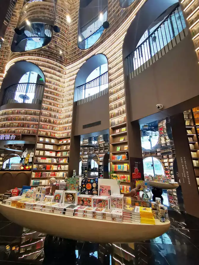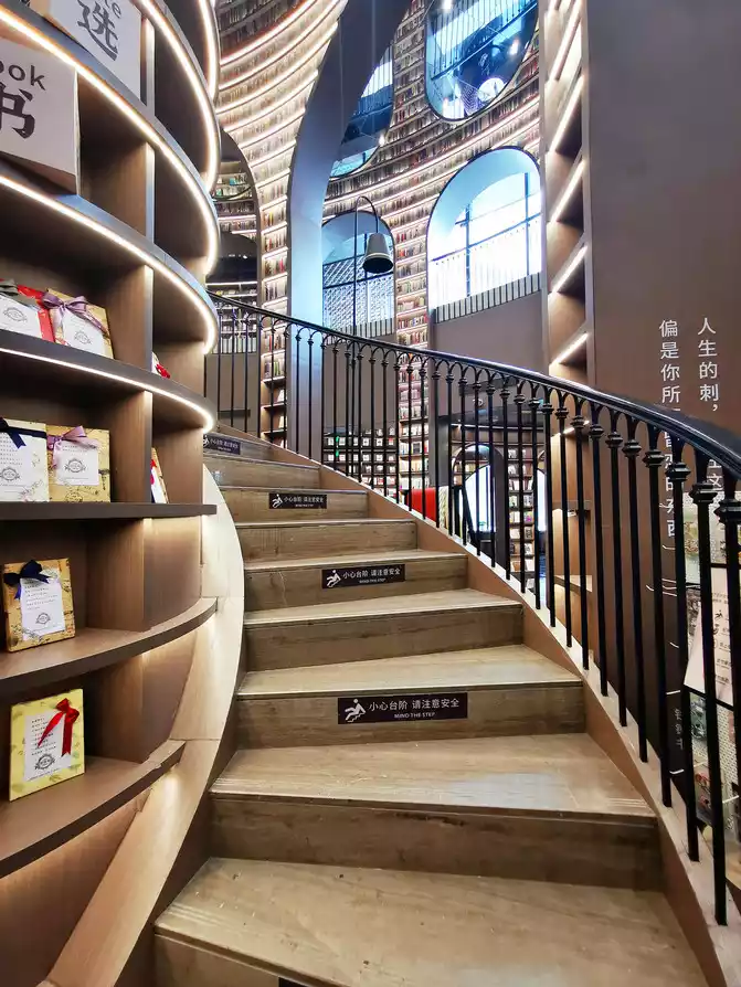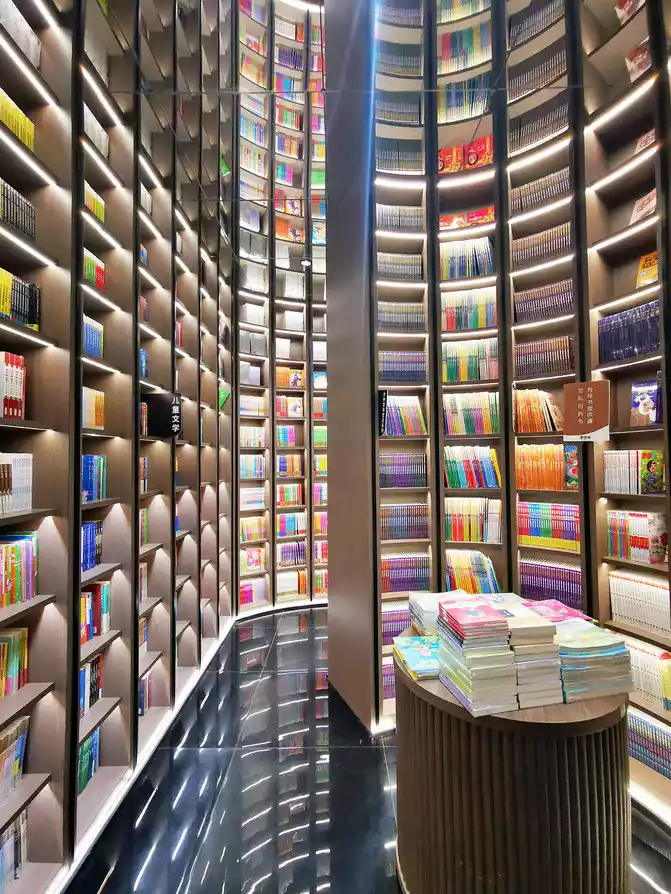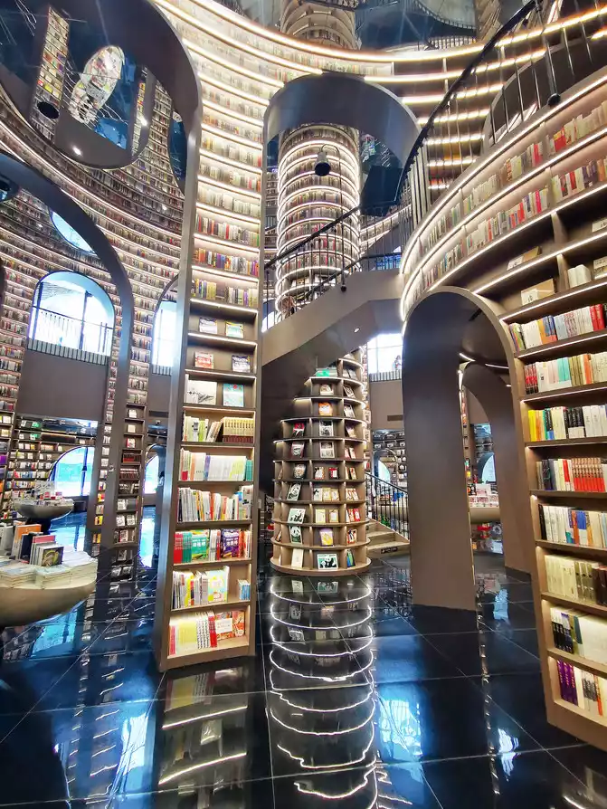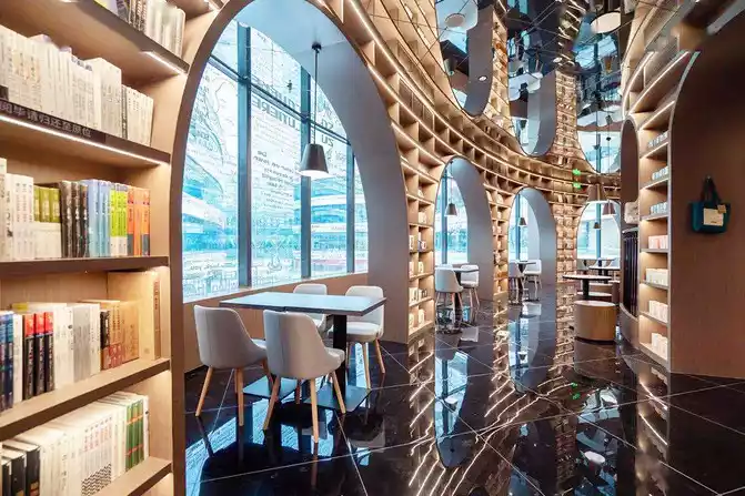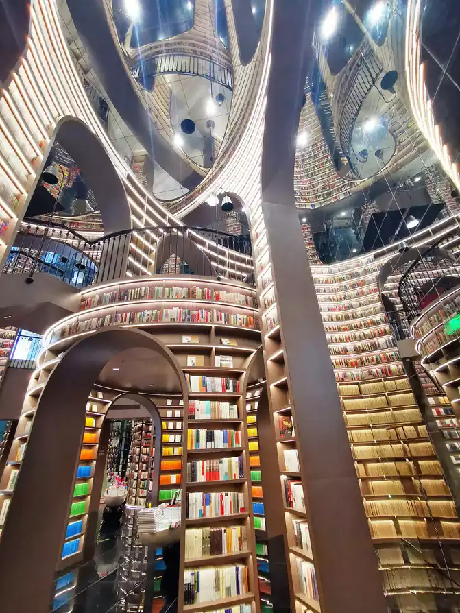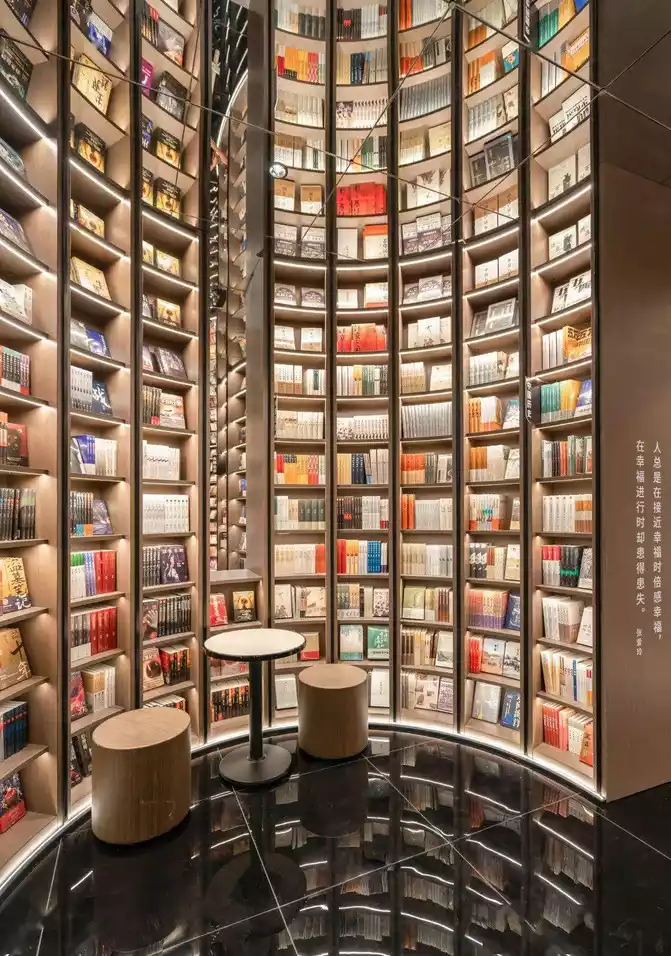Coming to the Central Literary District, the book wall is towering and majestic, like a super "city wall", and the scattered bookshelves are like "ships" quietly moored on the lake, swaying and fluttering between the bookshelf walls, although the books at the highest position of the bookshelf are purely decorative, but it is said that there are as many as 80,000 books that readers can touch, the bookshelves stand and overlap, the 180° transparent mirror image contrast up and down, people can't distinguish between the virtual and the real, the arched bookshelves are like the towering skeleton of the future three-dimensional city, reflecting magical graphics in the mirror, Looking down from a high place in the reading corridor on the second floor, you can feel the majesty of the space, light and shadow intertwined, and the whole space presents a sense of time and space confusion, which is indeed much stronger than the look and feel of Shanghai Zhongshuge.