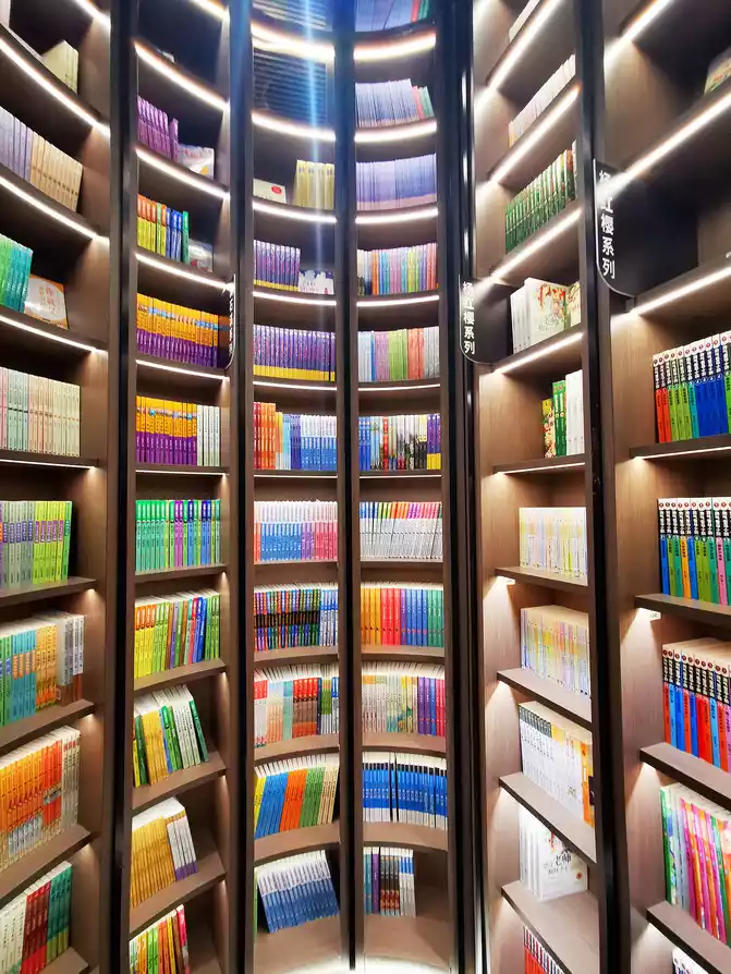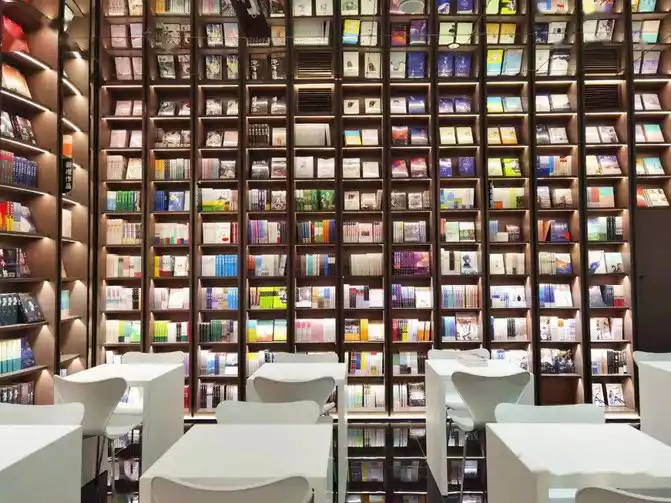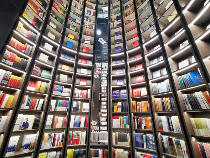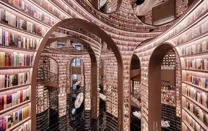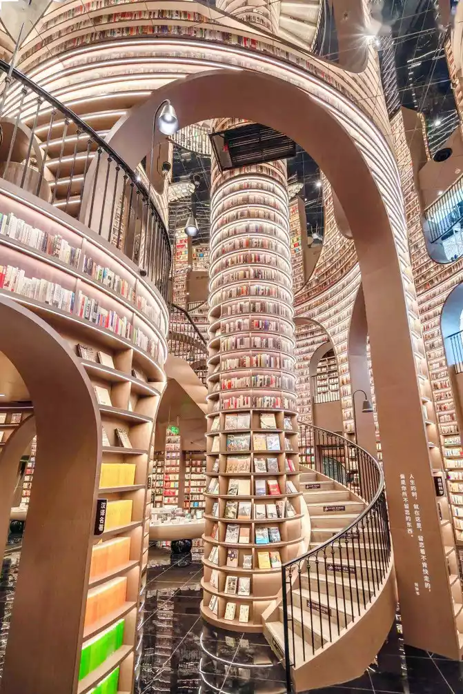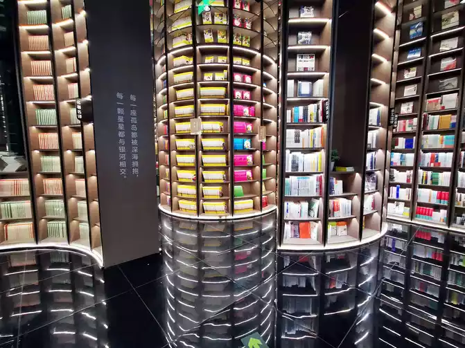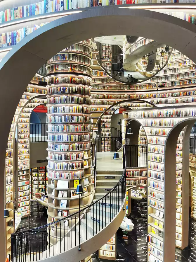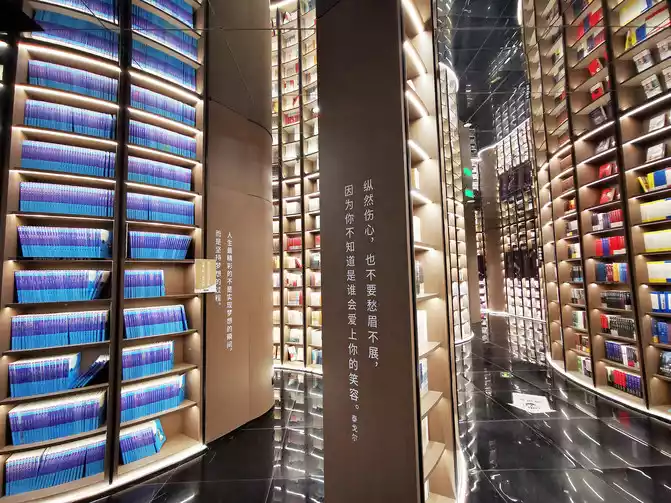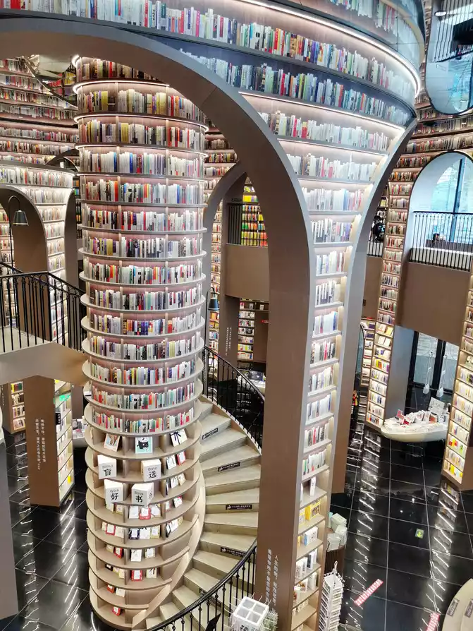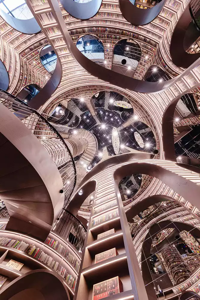 Coming to the Central Literary District, the book wall is towering and majestic, like a super "city wall", and the scattered bookshelves are like "ships" quietly moored on the lake, swaying and fluttering between the bookshelf walls, although the books at the highest position of the bookshelf are purely decorative, but it is said that there are as many as 80,000 books that readers can touch, the bookshelves stand and overlap, the 180° transparent mirror image contrast up and down, people can't distinguish between the virtual and the real, the arched bookshelves are like the towering skeleton of the future three-dimensional city, reflecting magical graphics in the mirror, Looking down from a high place in the reading corridor on the second floor, you can feel the majesty of the space, light and shadow intertwined, and the whole space presents a sense of time and space confusion, which is indeed much stronger than the look and feel of Shanghai Zhongshuge.
