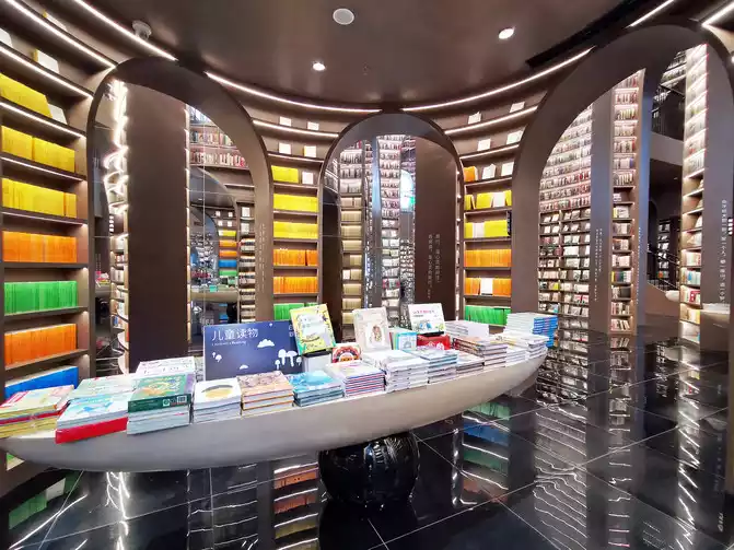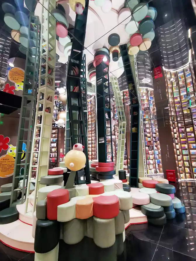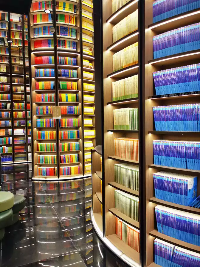 "Rise because of the weir, prosper because of the water", the design of Zhongshuge is inspired by the magnificent dam of Dujiangyan, relying on cleverly placed mirrors and sparkling black tile floors to create an amazing illusion, the mirrored ceiling simulates the effect of infinite opening and extension, pushing open the glass door of the subtitle wall of Zhongshuge, as if you are Alice in Wonderland, this is a "Hogwarts" magic castle, the rustic walnut color C-shaped bookshelves are irregularly arranged in front of you, and the unique and vivid arc cleverly separates the various areas, Shuttle under the huge bookshelves, more like walking in a maze of books, stop and go, feel that time has slowed down a lot, through the winding and deep bookshelf wall, the picture book area is suddenly revealed, here, cute pandas are turned into decorations, and small colorful cushions of different shapes are stacked into the shape of hills, creating an exclusive reading space for children, cute and dreamy.