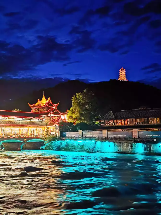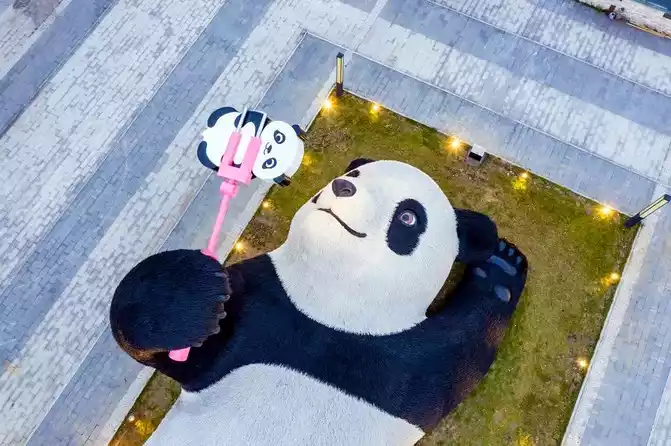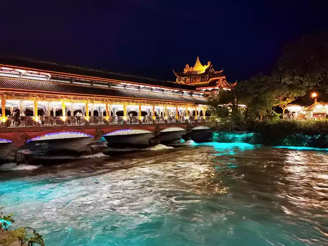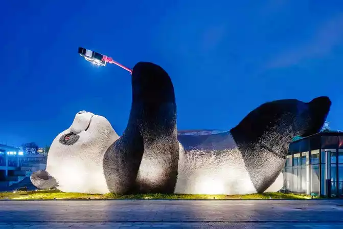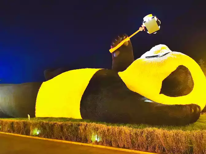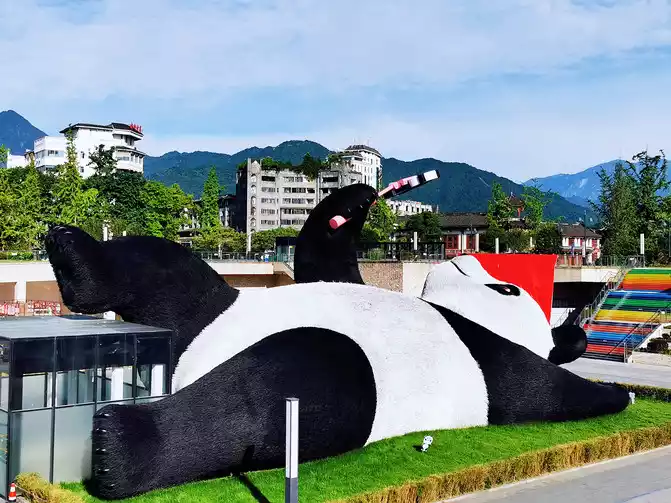 The beauty of Dujiangyan belongs to the day, but also to the night, the night view of Dujiangyan can be described as "magnificent and spectacular", modern optoelectronic technology and ancient buildings are integrated, lighting up the city's romantic night, even the giant panda of Dujiangyan has sprouted out of the sky, actually lying on the Yangtianwo Square to play selfies, this giant panda lying on the back selfie is 26 meters long, 11 meters wide, 12 meters high, weighing 130 tons, fixed by more than 3 million lacquered stainless steel wires, it lies comfortably with its headrest, kicks up its fat feet, Holding a pink selfie stick and taking a selfie next to the rainbow stairs, isn't that contented look and leisurely posture the same as the leisurely Sichuan people?