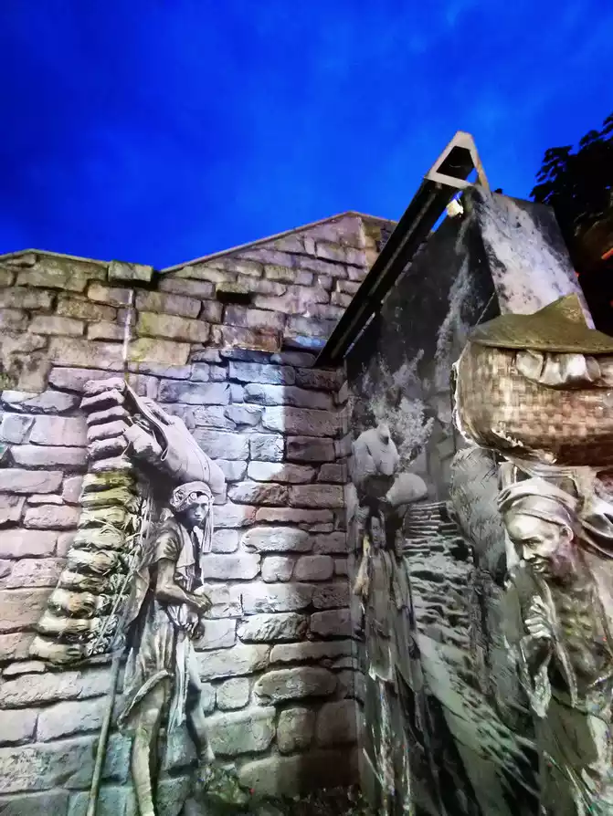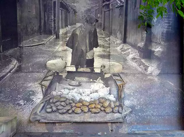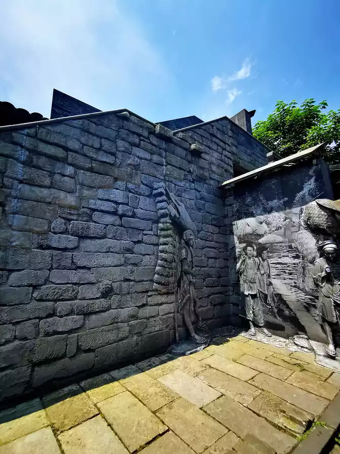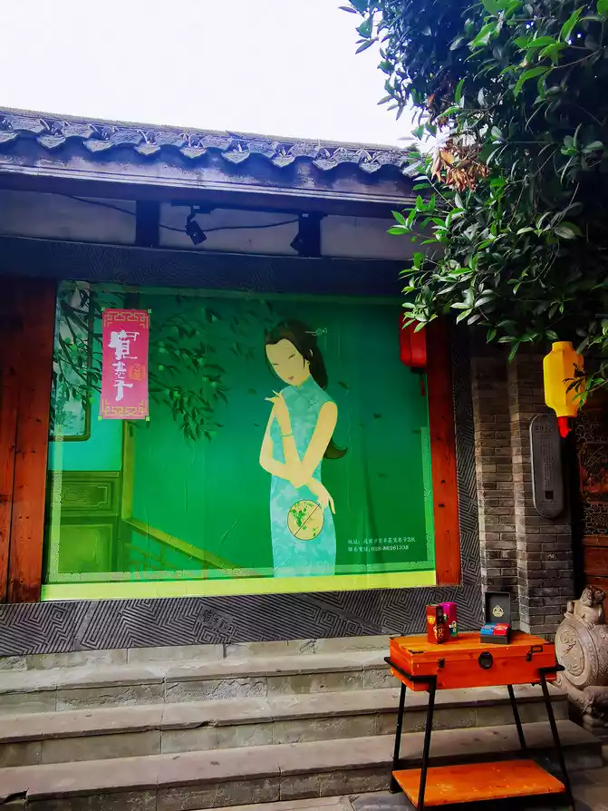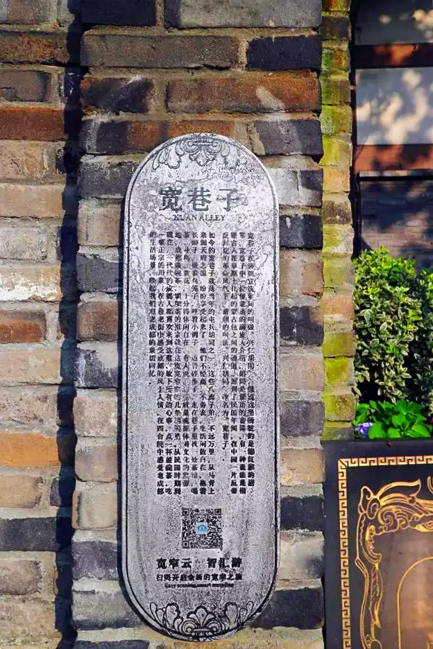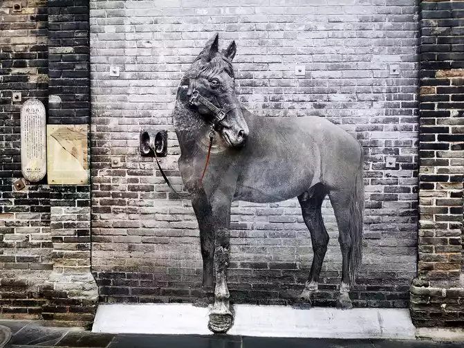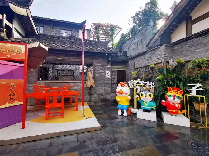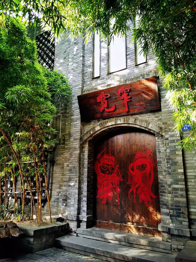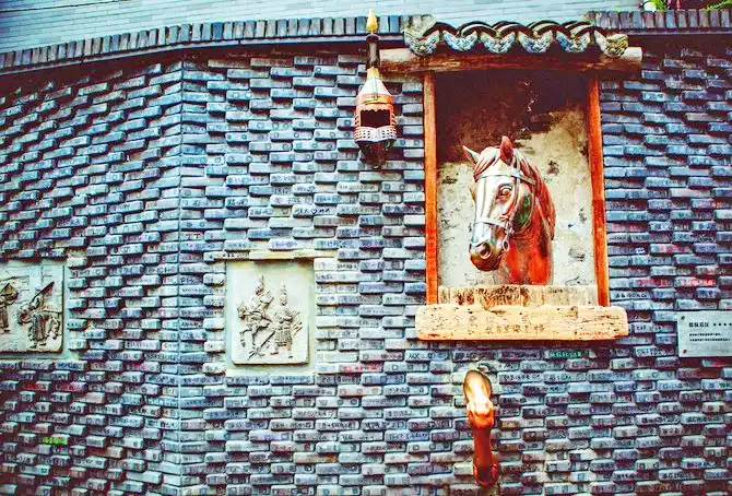 Kailu, one of the most iconic doors in the wide and narrow alleys, the courtyard gate is made of special green bricks to form an arched house door with an arc, the door opening is embedded with a traditional Chinese stone plaque, the plaque is carved with large seal Yang carved "Kailu", and the oval pattern built above the stone plaque represents the high-hanging "evil mirror", which is intended to suppress all kinds of demons and keep the family safe forever.The horse tethering stone is located on the old wall at the head of No. 32 in the narrow alley, an antiquity of the Qing Dynasty, is a symbolic manifestation of northern culture in western Sichuan, about 1.2 meters above the ground, weathered and mottled, is one of the only three remaining horse tethering stones in the wide and narrow alley, now covered with tempered glass to protect it, and the tethering stone holding the stone horse next to it is a replica. When Chengdu rebuilt the wide and narrow alleys, 40,000 bricks of different eras were collected, and on the south side of the alley, these bricks were used to build brick walls along the street, and the brick walls were inlaid with spray painting photos, and there were reliefs in the spray painting photos, building a brick cultural wall and folk photo wall that displayed the history, culture, and folk customs of the old Chengdu, which was the reproduction of the old Chengdu in the market, and the first museum in our country to use bricks as a carrier. Each wall stack is engraved with a historical memory.