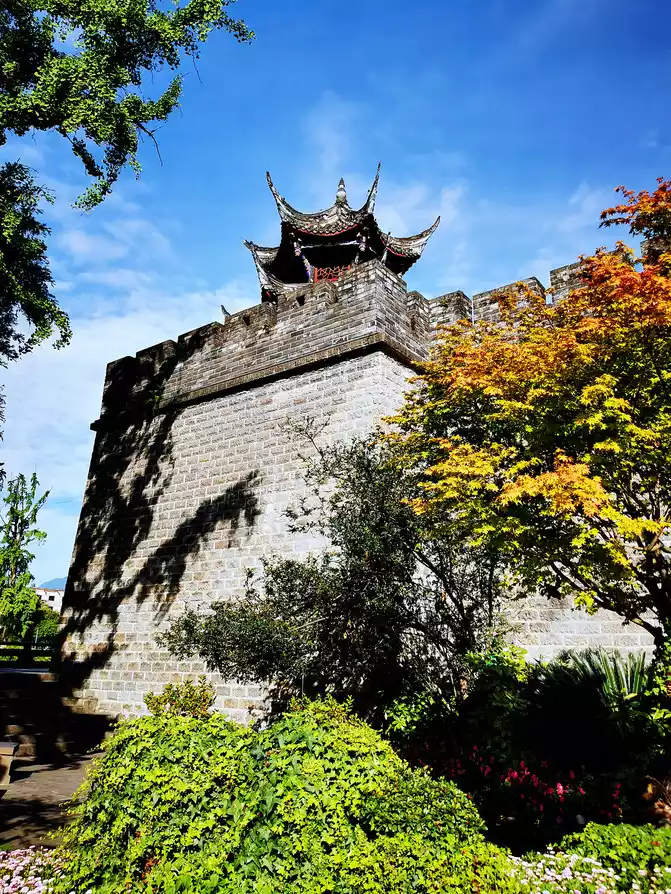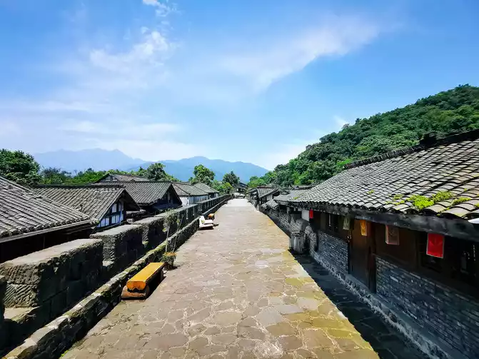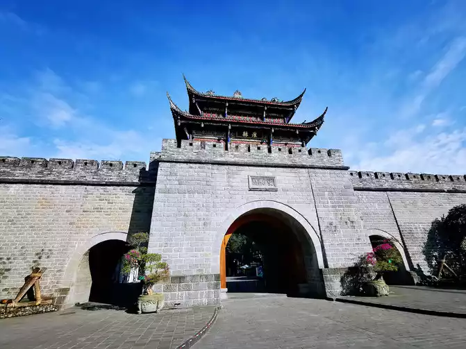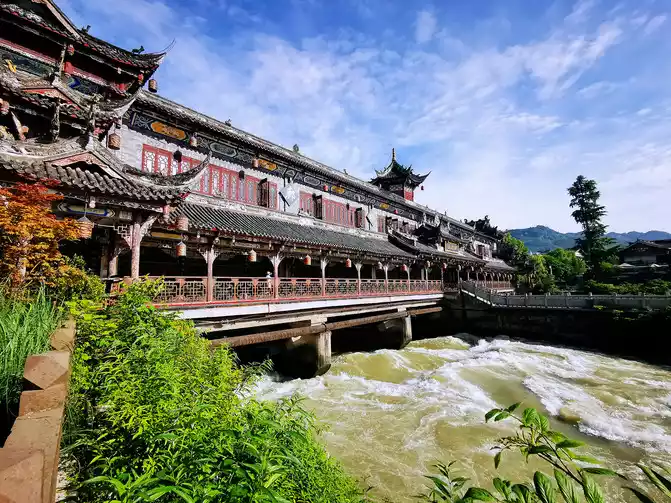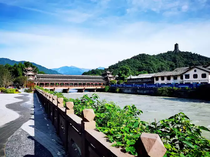 In the early morning, the curtains were opened, the blue sky swept away the haze of the previous day, a bowl of authentic fat sausage hot and sour powder made me full of energy, and then went to say good morning to the cute "selfie giant panda", I passed through the east gate of the ancient city of Guanxian County, walked through the South Bridge, and headed towards the Dujiangyan Scenic Area. The famous Dujiangyan is known to everyone, one of the few cities in the world that integrates world irrigation engineering heritage, world cultural heritage, and world natural heritage, but when it comes to its former name Guanxian, it is not necessarily known by most people, Guanxian began in the Northern and Southern Dynasties, is an ancient city accompanied by a thousand-year-old ancient weir, there is a scenery in the city, there is a city in the scenery, half a mountain and half a city, with a unique "water culture" characteristics, after the "golden iron horse" years, since ancient times it has been a place for soldiers, West Street is the starting point of the ancient tea horse road, Xiguan is a throat fortress leading to the Songmao area. Entering from the "Xuanhua Gate" of the East Gate City Tower, the antique buildings on both sides of the street live by the water, the Yangliu River passes through it, next to the South Street Mosque is the West Street, the Sanbai Cave Covered Bridge is unique, the rushing Minjiang River water is divided into two here, and the three big characters of "Tianfuyuan" on the front of the bridge immediately bring people into the situation of water control in that year.