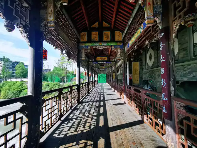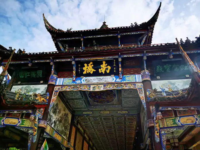 The South Bridge, formerly known as the "Puji Bridge", was built in the fourth year of Guangxu in the Qing Dynasty (1878), the bridge is about 133 meters long, it has been damaged many times, repaired again in 1979, and restored and rebuilt after the 2009 earthquake, known as "the first bridge of the river", and the folk have a cloud: "Stepping on the South Bridge, the wind and rain are smooth, and the grains are abundant". The majestic corridor-style ancient bridge stands between South Street and Fuxing Street, where carved beams and paintings, folk colored sculptures, calligraphy and painting couplets are integrated, known as the "water painting building", the bridgehead pavilion, the cornices pierce the air, the carved beams and painted beams, the bridge body is painted, dazzling, looking up at the roof, reproducing classic pictures such as "Hai Rui's Dismissal", "Water Man Jinshan", "Sun Wukong's Three Dozen White Bone Spirits", etc., with different moods, lifelike and beautiful.