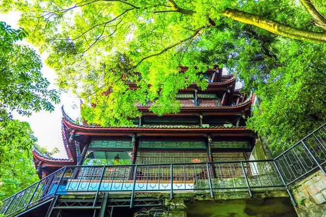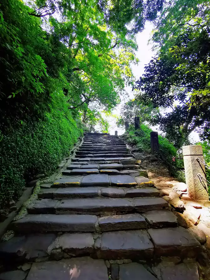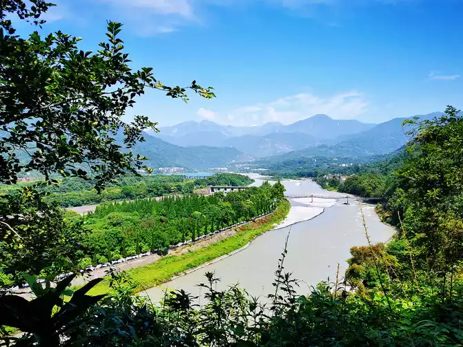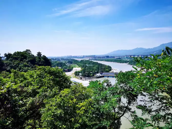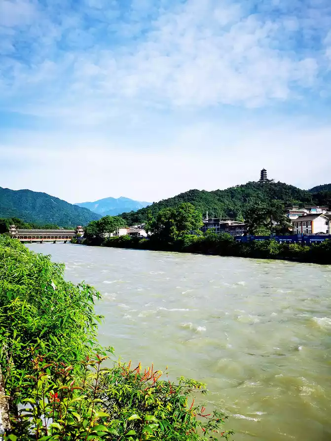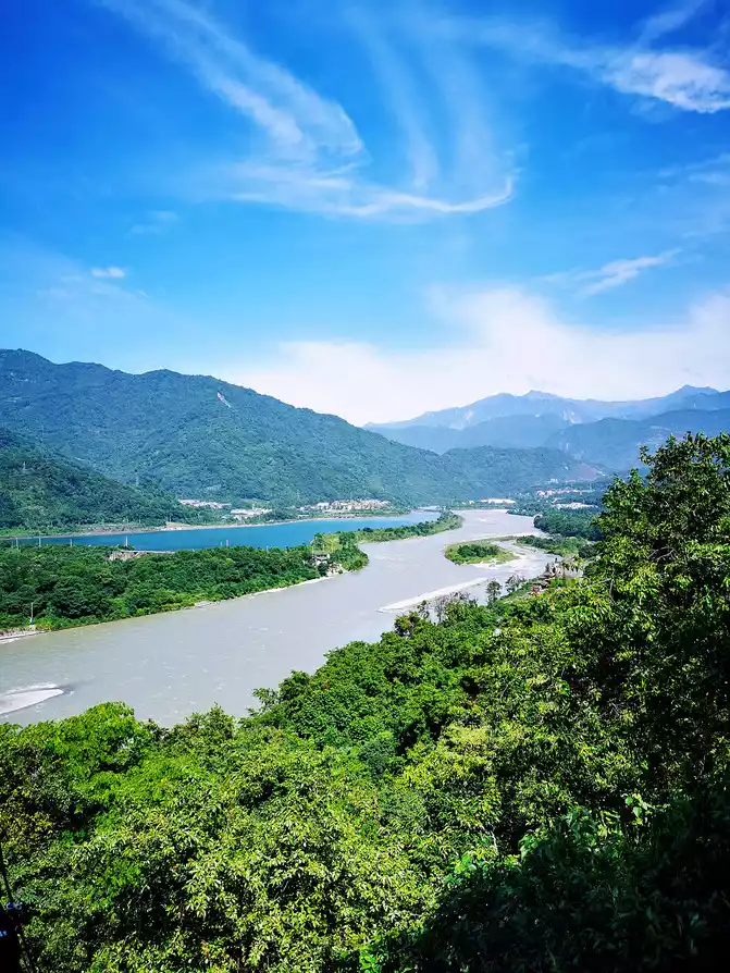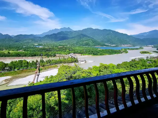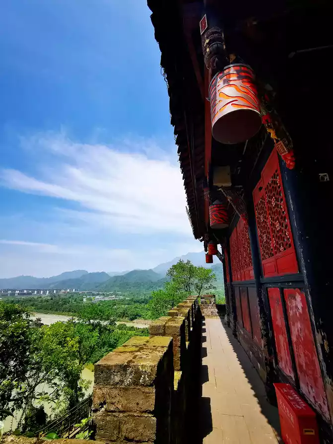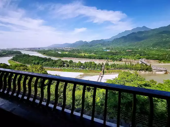 Qinyan Tower, named after Dujiangyan built in the Qin State, stands on the mountain, stands on the riverbank, steep and spectacular, is the best position to look at the panoramic view of Dujiangyan, Chairman Mao stood here in 1958, climbed the Qinyan Tower to look at the extreme view, Dujiangyan's three major water conservancy projects, Anlan Bridge, Erwang Temple, Ancient Post Road, Yulei Xiongguan have a panoramic view, very spectacular, bathed in the gentle mountain breeze, as far as the eye can see, the peaks are stacked, the river flows, and the emerald green color is getting thicker.