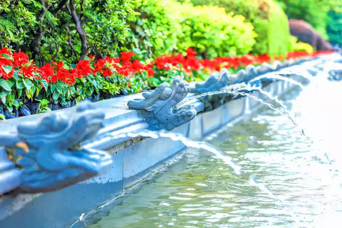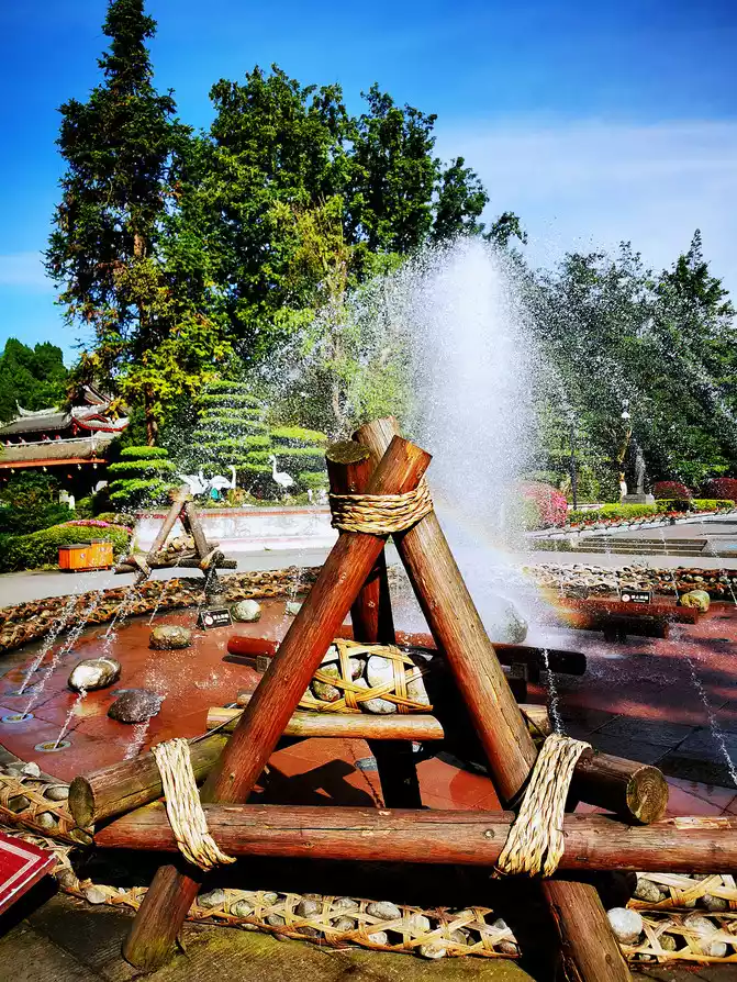 Entering the scenic spot, strolling forward, hearing the sound of gurgling water, following the sound of the water, only to see a circular fountain, a column of water sprayed out into an arch, poured on the iron pillars lying on the ground, splashing with splashes, these lying iron pillars are called lying iron, which is a sign of the depth of the riverbed of the Neijiang River every year, and it is said that Li Bing buried a stone horse under the bed of the Neijiang River when he built the weir, as the standard for the depth of the beach every year, and later evolved into a horizontal iron, and the existing 4 horizontal irons are the fourth year of Wanli in the Ming Dynasty and the third year of Tongzhi in the Qing Dynasty. Buried in the sixteenth year of the Republic of China and 1994, known as the "water divine needle" of Dujiangyan, the four lying irons seen at the fountain are replicas, and their authentic products are still buried under the bed of the Neijiang River, hidden in the torrential river water, the fountain is surrounded by rafts and stone bamboo cages, used as cofferdams, whether it is bamboo cages or rafts, they are good tools for water control, and have been used for more than 2,000 years, reproducing the superb wisdom of the ancients to use local materials to block the river and intercept the flow.