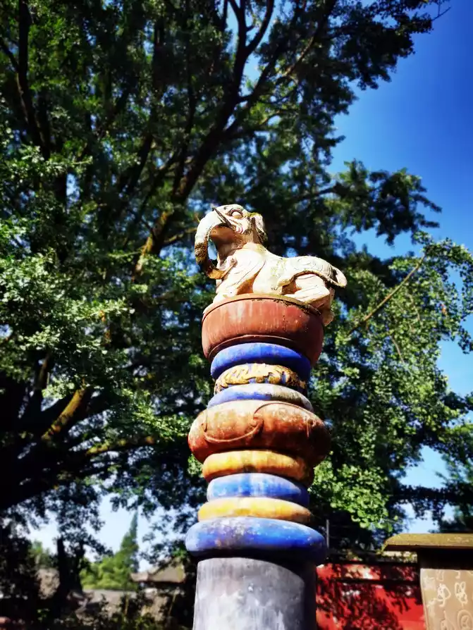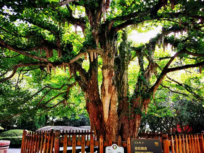 There is a longyin ditch on the left and right sides of the Weir Gong Road, a total of 248 large and small dragon heads spit water into the ditch, the water in the ditch comes from the Min River, direct flow to the bottom of the lying iron, the Zhangsong ginkgo on the right is 1800 years old, still lush and leafy, full of greenery, in 2004 when competing for the "King of Tianfu Tree", won the honor of "Top Ten Famous Stakes", it is also the prototype of the ginseng fruit tree in the 80th edition of "Journey to the West" in "Stealing Ginseng Fruit", The tree is 6.3 meters high, the widest circumference is up to 5 meters, the bottom of the trunk stands side by side, and the branches grow horizontally after merging into one at a height of 1 meter.