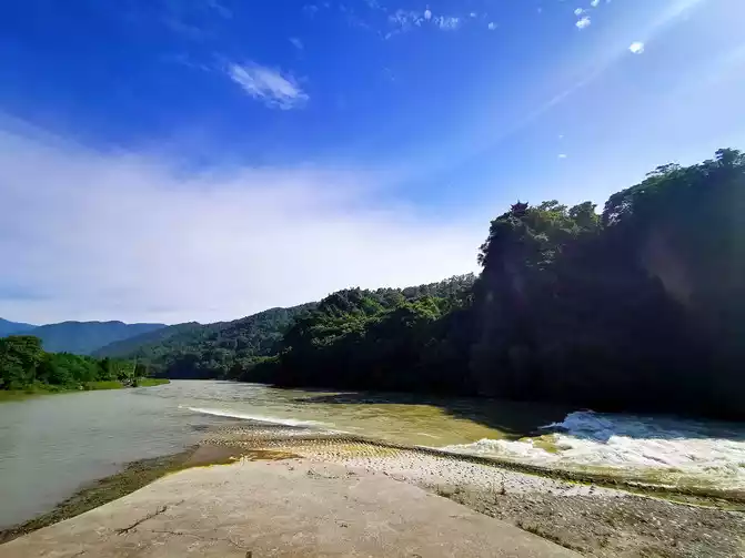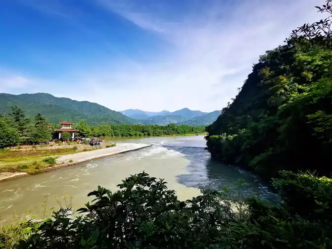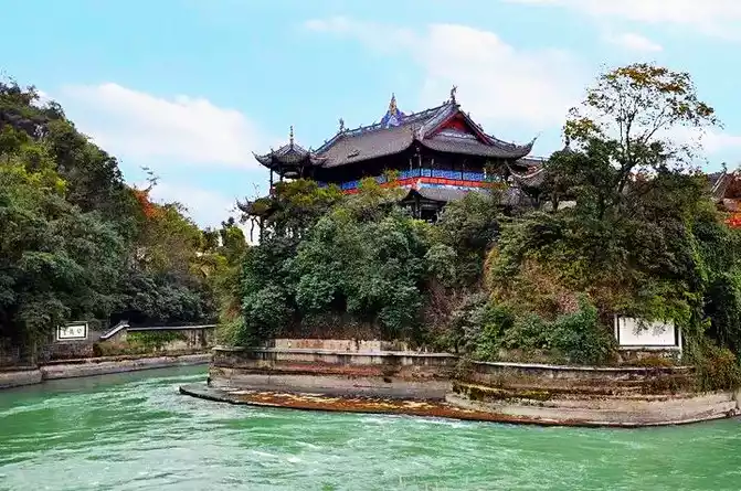 case of no explosives at that time, if it takes at least 30 years to chisel with a hammer, Li Bing came up with a method of boiling water to pour water, using the principle of thermal expansion and contraction to make the rock burst, speed up the progress of the project, and finally carved out a mountain pass 20 meters wide, 40 meters high, and 80 meters long in Yulei Mountain eight years later - "Treasure Bottle Mouth", The mountain left in the center of the river, that is, the stone pile separated by the excavation of Yulei Mountain, is called "Li Dui", Fulong Temple is built on the terrain of the ridge of Lidui Mountain low in front and high in the back, suspended on three sides, the excavation of Yulei Mountain balances the flow of river water on the east and west sides of the Min River, which not only alleviates the flood disaster in the west, but also relieves the drought in the east, which is the key link in flood control and the first step of the Dujiangyan project.