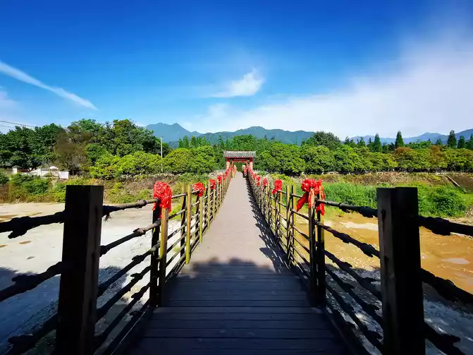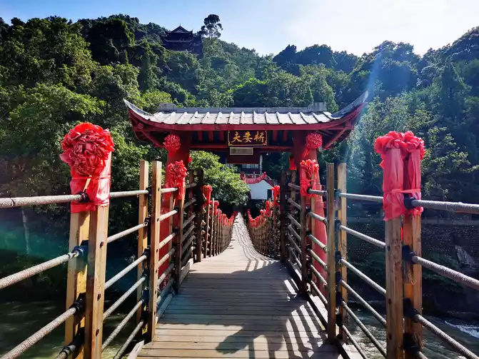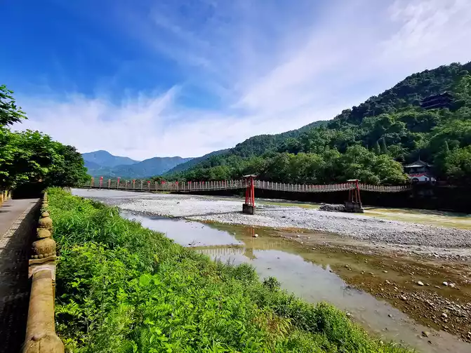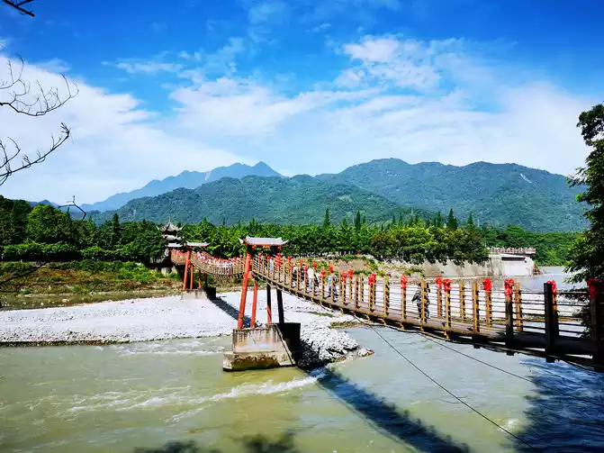 The Anlan Rope Bridge on the Yuzui Diversion Dike of Dujiangyan, built before the Song Dynasty, is the oldest existing rope bridge in China, known as the "Five Great Bridges of Ancient China", with a total length of 261 meters, flying over the north and south of the Min River, originally supported by wooden stone piers, hanging across the river with thick bamboo cables, paving wooden planks as the bridge deck, with bamboo ropes as fences on both sides, steep and firm, people walking on it, swinging violently, swaying left and right, looking down at the rapids and dangerous shoals, river valley sand and gravels, thrilling and exciting, the construction of this rope bridge is a civilian couple, so it is also known as the "husband and wife bridge", It contains the beauty of "walking on the bridge, sweet to permanent".