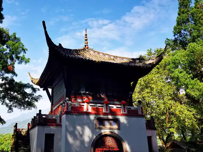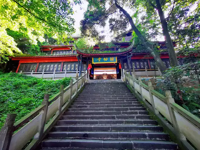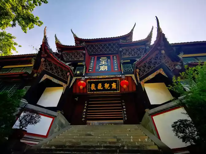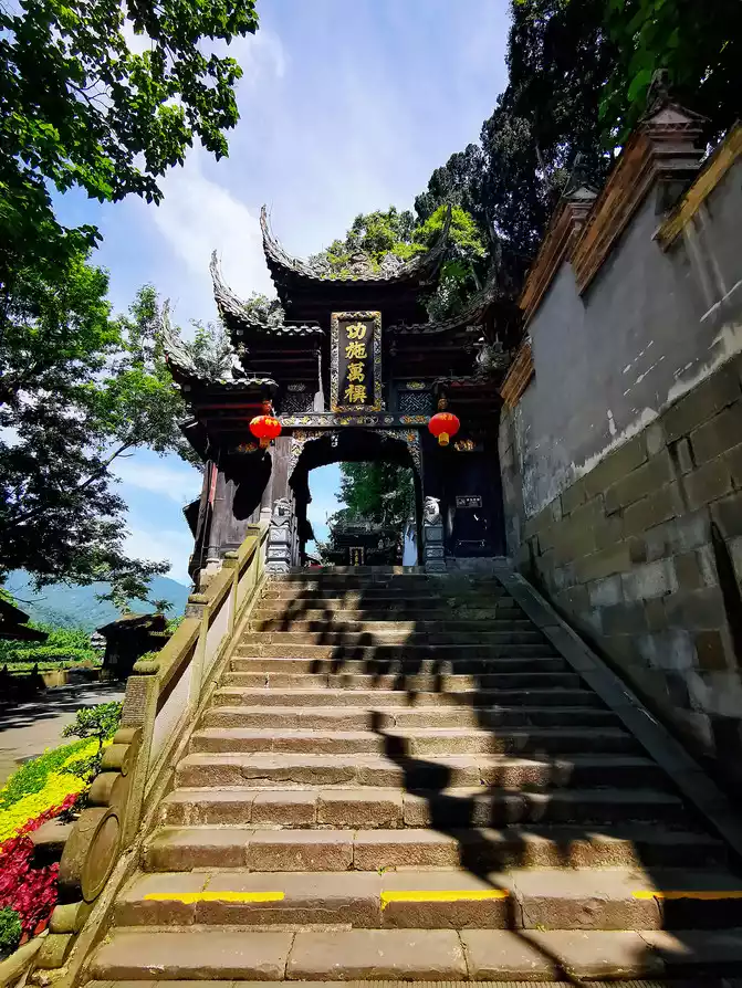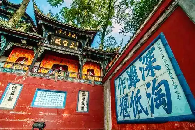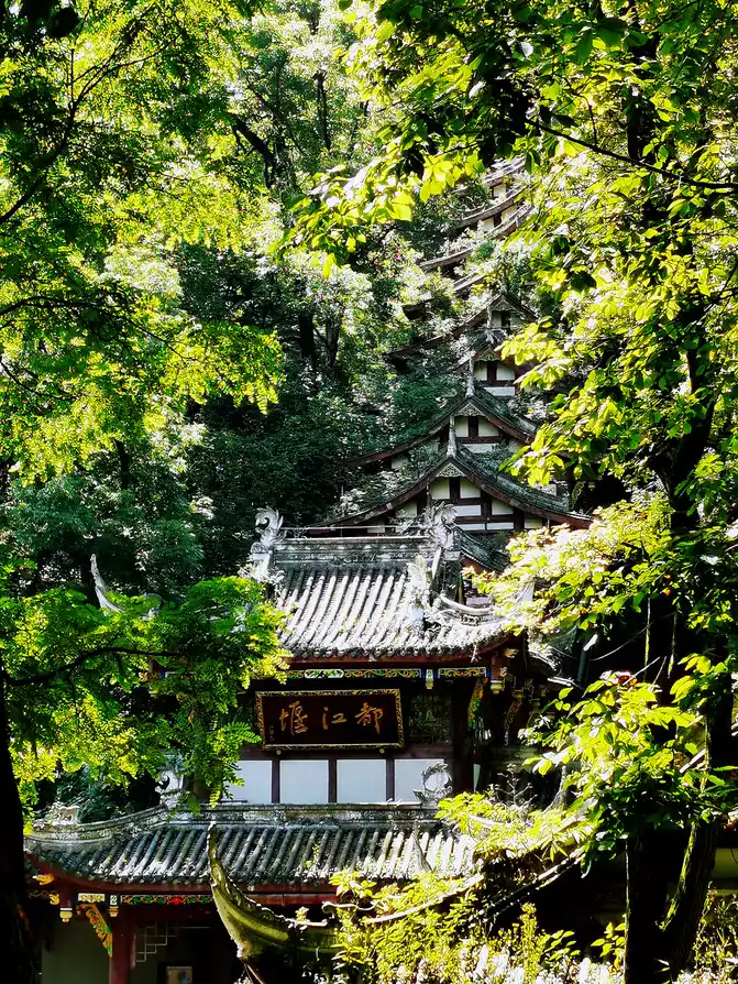 The Erwang Temple, a temple built to commemorate Li Bing's father and son during the Northern and Southern Dynasties, the people are grateful for its kindness and spontaneously enter the incense and worship, from ancient times to the present, the incense is in full swing, and there are many stone inscriptions on the gable wall of Dujiangyan's water control experience "Deep Taotan, Low Weir", etc., known as the 82-character water control "Three Character Classic", which is still the guideline for Dujiangyan water control, the whole building complex is hidden in the depths, the ancient trees are towering, the trees are shaded, only a few corners of the house are exposed, a few white walls, and there are pavilions and pavilions scattered in the depths of the dense forest and the cliffs between the mountains.