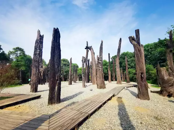 The garden area hides a 10,000-year-old ebony forest, which is a trace of the vicissitudes of time, a witness to the great changes in the environment, and a characteristic landscape composed of more than 60 ebony unearthed from the Jinsha site and Chengdu area, with its own high cold temperament, unique in China, these ebony have a history of 3,000-12,000 years. Ebony refers to all kinds of precious ancient trees buried under the ancient riverbed for thousands of years, not all ancient trees can be transformed into ebony, generally with fragrance or sterilization characteristics of tree species can form ebony, such as nanmu, red camellia, camphor tree, they have gone through a long-term reaction process such as physics and chemistry, forming a "living fossil" like stone but not stone, like wood but not wood, the wood is hard and delicate, from the surface to the core is jet-black, the texture is clear, very precious, as the saying goes, "the family has ten thousand taels of gold, not as good as ebony".