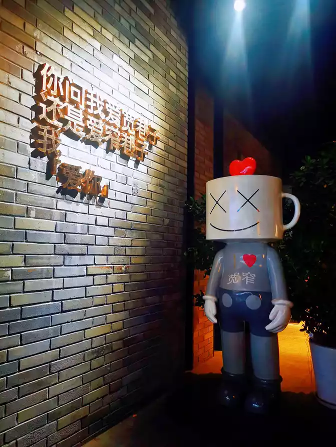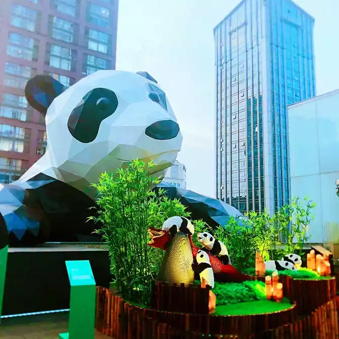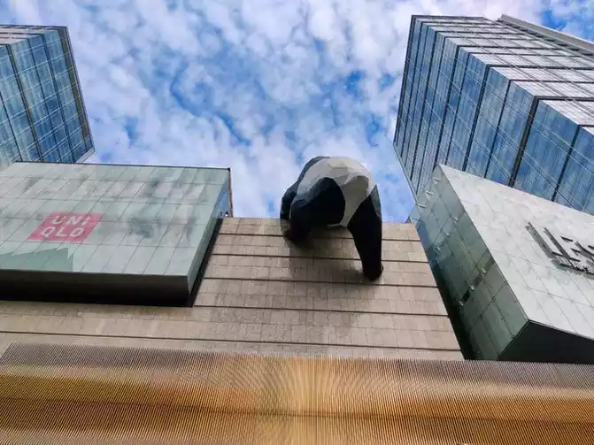 My friend specially drove to Dujiangyan to pick me up and take me back to Chengdu to visit Chunxi Road, now Chunxi Road is not only Chunxi Road, but also Taikoo Li and IFS next to it, constituting the most prosperous business district in Chengdu, the famous "Wall Climbing Panda" is lying on the outer wall of IFS, butt down facing Hongxing Road Pedestrian Street, about 15 meters high, as if just escaping from the wild into the city, full of curiosity about the bustling world, on the open-air platform on the 7th floor of the mall can see the front of the panda, a big face is stupid and stupid, the shape is more like a building block, It is made of nearly four thousand triangular components.