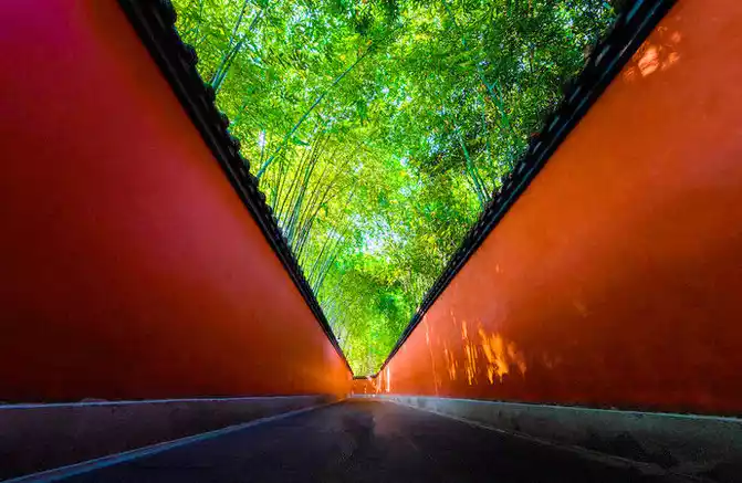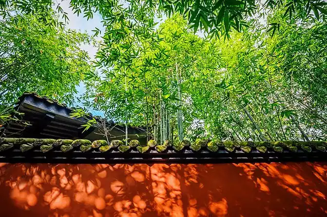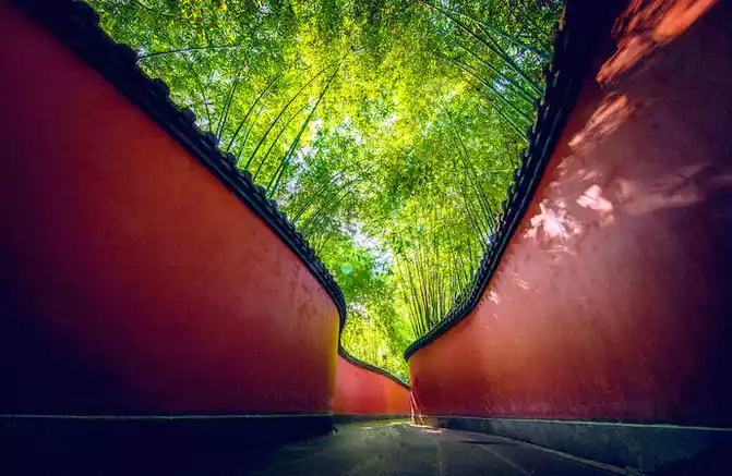 I believe that every tourist who comes to Wuhou Temple to check in will not miss the red wall bamboo forest here, on both sides of Huiling Gate, two red walls flank the road, winding and extending, twisting and turning, in the turning place always makes people have a deep feeling of corridor, the tile eaves on the red wall have grown moss under the waste of time, the sunlight reflects the mottled tree shadows on the wall through the bamboo forest, red, green, and vaguely visible blue sky and white clouds, the three tones are so harmoniously in the same picture, walking in the shadow of the red wall bamboo, as if traveling to ancient times, Feel the beauty of tranquility in this quiet morning, which has a unique taste (online borrowing picture).