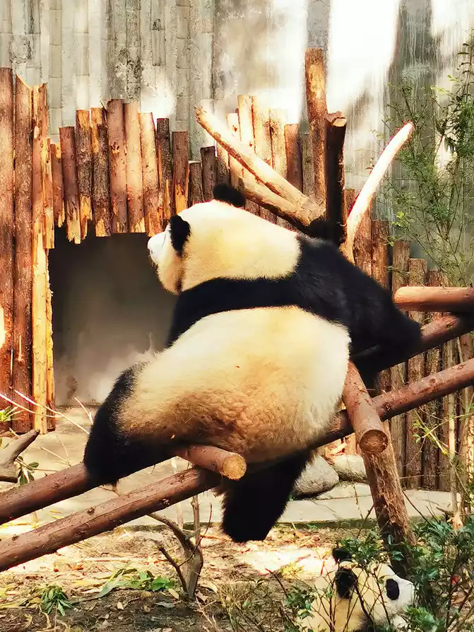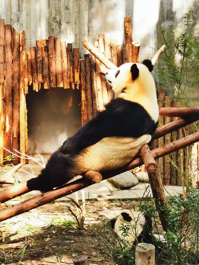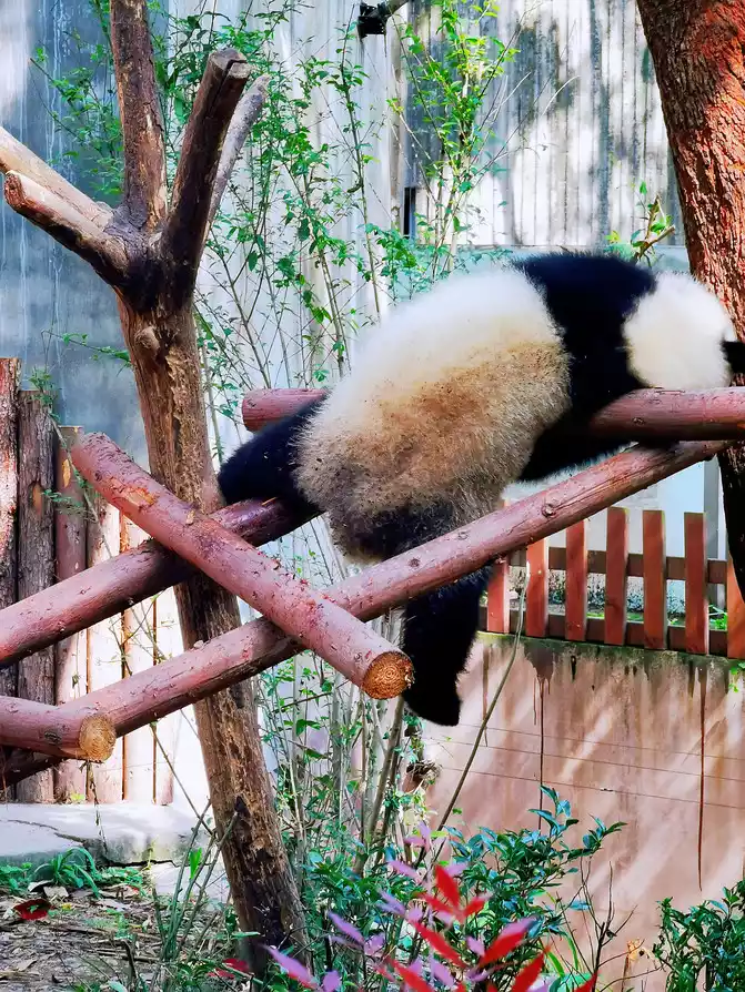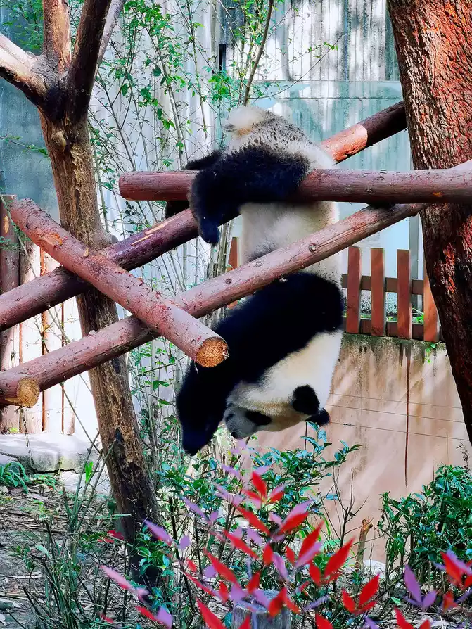 In comparison, juvenile giant pandas are more lively and active, they climb high and low, play in groups of three or five, play energetically, naïve, full of cuteness, several star babies are even more eye-catching, the funniest scene is a juvenile giant panda struggling to crawl up along the climbing frame, finally climbing to the top, is about to hang and play for a while, the adult giant panda mother takes heroic steps, three or two steps will come up, not even looking at her child, and falling on the shelf with her belly up. The child was overwhelmed, lost his center of gravity, and fell alive from the high shelf, it looked up aggrievedly, but still failed to get any attention from its mother, so it had to twist its buttocks and get up and find its own playground again, this scene was too funny, causing us to laugh again and again.