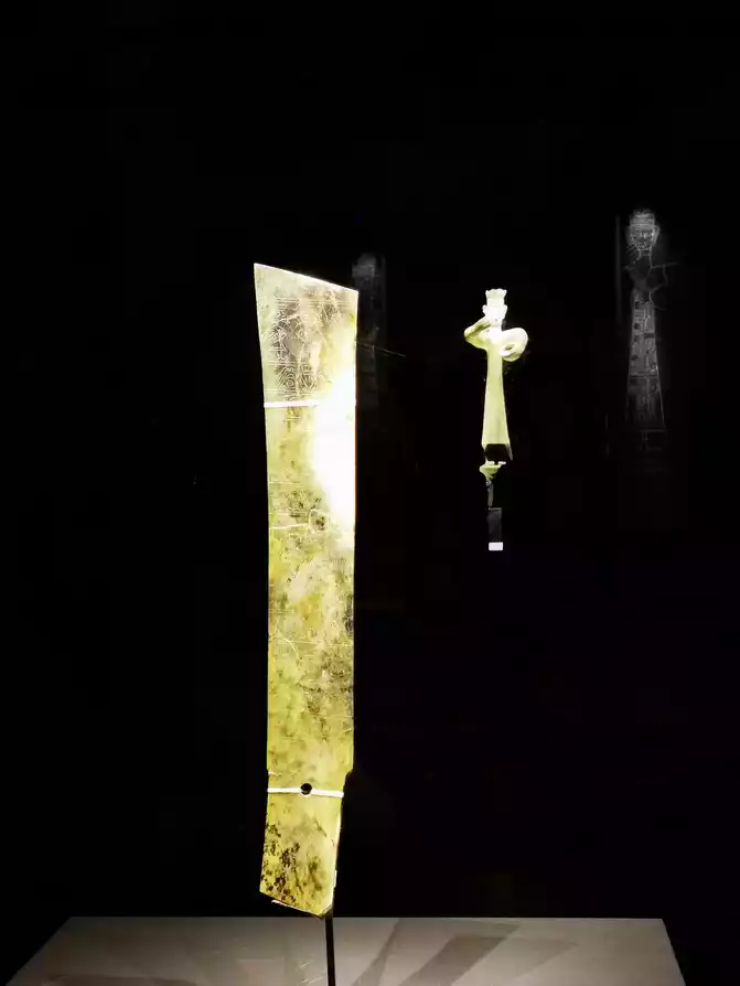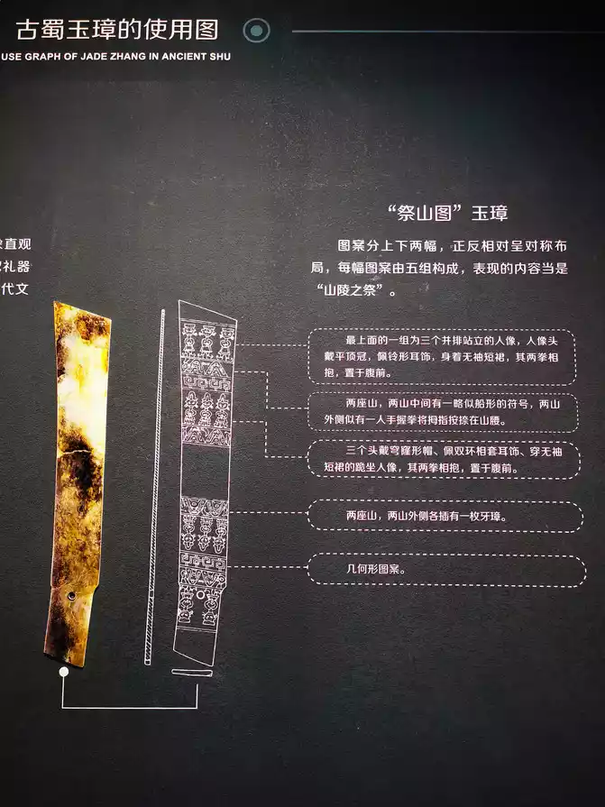 Thecarving technology represents the highest level of all jade in Sanxingdui, the pattern is symmetrical, and the pattern is fine and complex, reflecting the scene of the ancient Shu people holding jade zhang on the altar to sacrifice to heaven and earth and mountains, and freezing a vivid scene of social life in Sanxingdui theocratic country, and the value is self-evident.