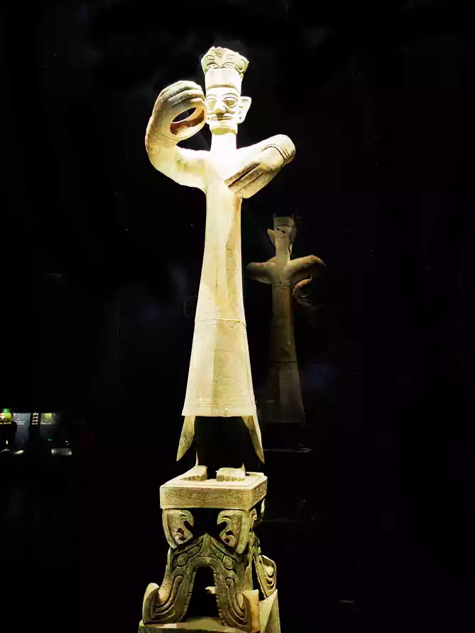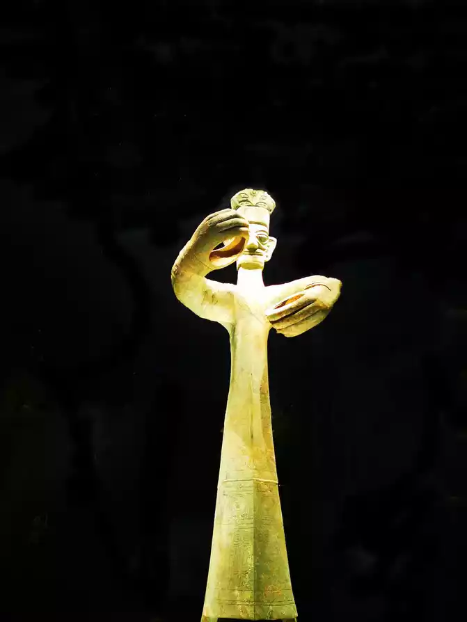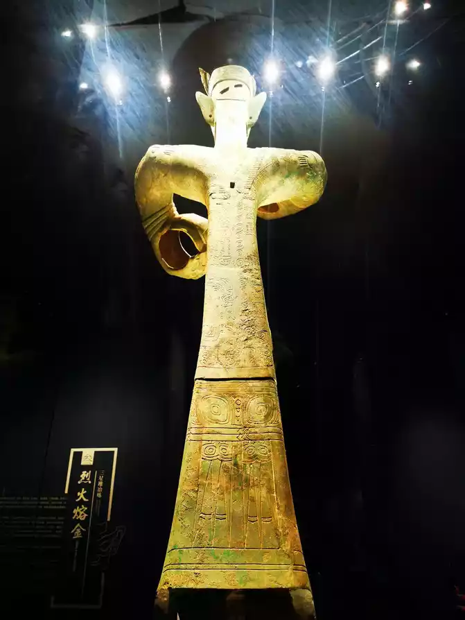 is the tallest and most complete bronze statue in the world at the same time, like the "Oriental Giant", known as the "King of Bronze Statues in the World". With a height of 2.608 meters, a height of 1.8 meters, and a weight of 180 kilograms, he stands on a monster-shaped pedestal, with a unique face shape, a high nose bridge, thick eyebrows and big ears, like a Westerner, with a slender body, hands in a circle, and complex clothing decorations, he may be both a Shu king or a wizard with supreme power, the overall image is elegant and solemn, as if passing through thousands of years, still exuding the light of a king.